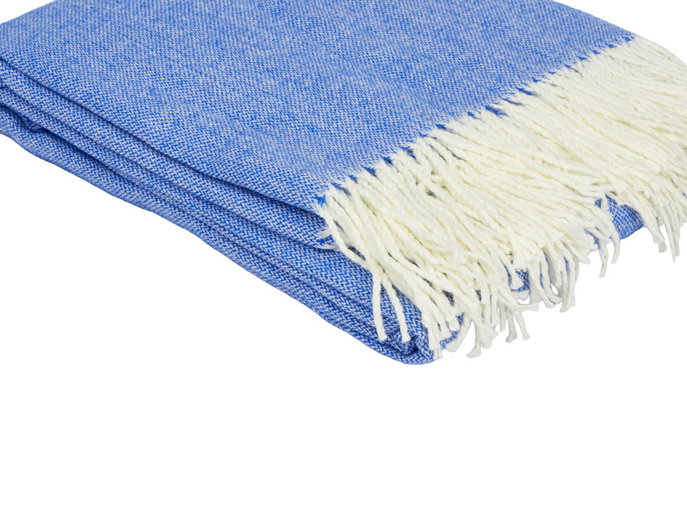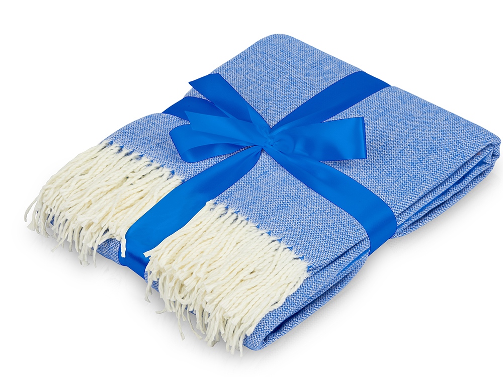 Большой размер этого мягкого плотного пледа позволяет использовать его как одеяло и как покрывало для вашего интерьера. По бокам плед украшен бахромой. В комплекте идет упаковочная синяя лента, на которой можно сделать нанесение вашего логотипа.