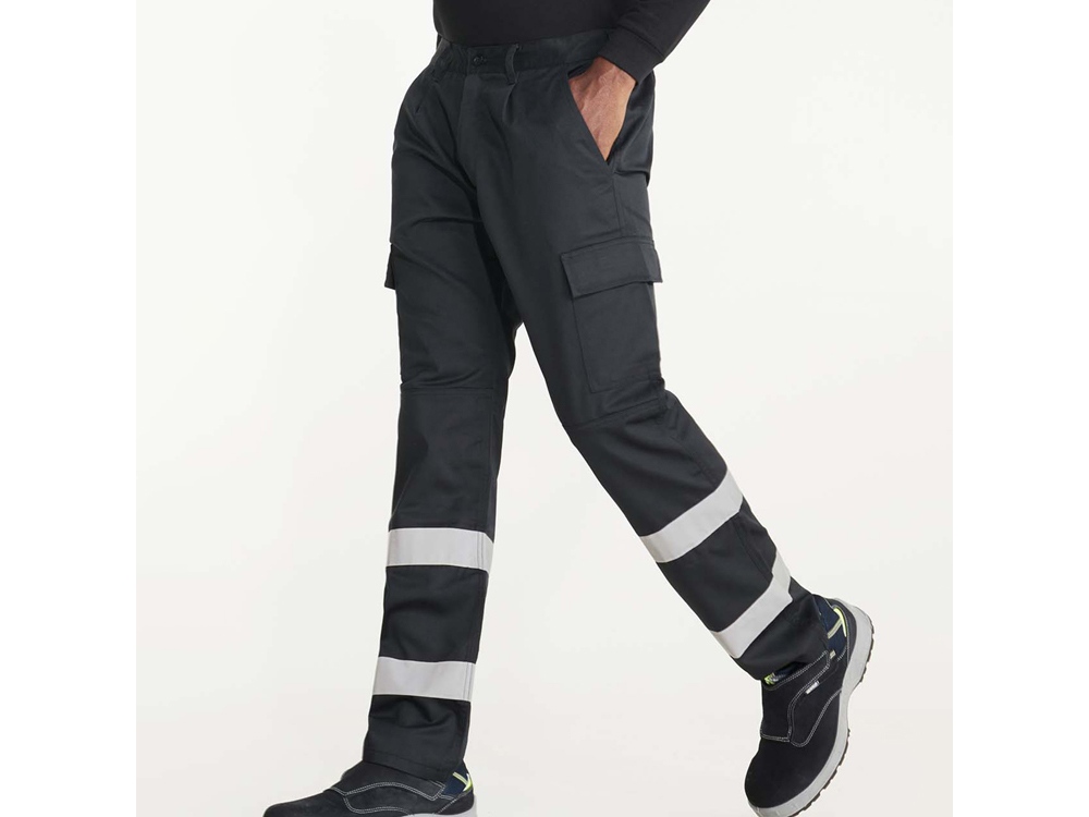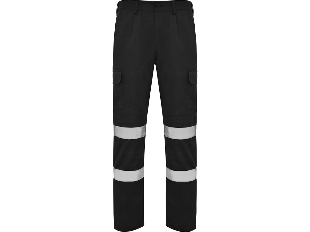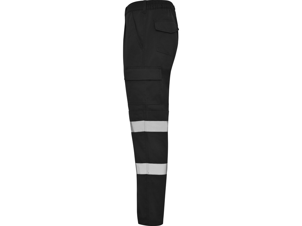 Брюки из прочной ткани. 1. Регулируемый эластичный пояс сзади. 2. Два кармана спереди. 3. Функциональный карман сзади с клапаном на липучке. 4. Два боковых карманы с клапаном на липучке. 5. Дополнительное усиление сзади для защиты от протирания при сидении. 6. Двойная ткань на коленях. 7. Две горизонтальные светоотражающие полосы.