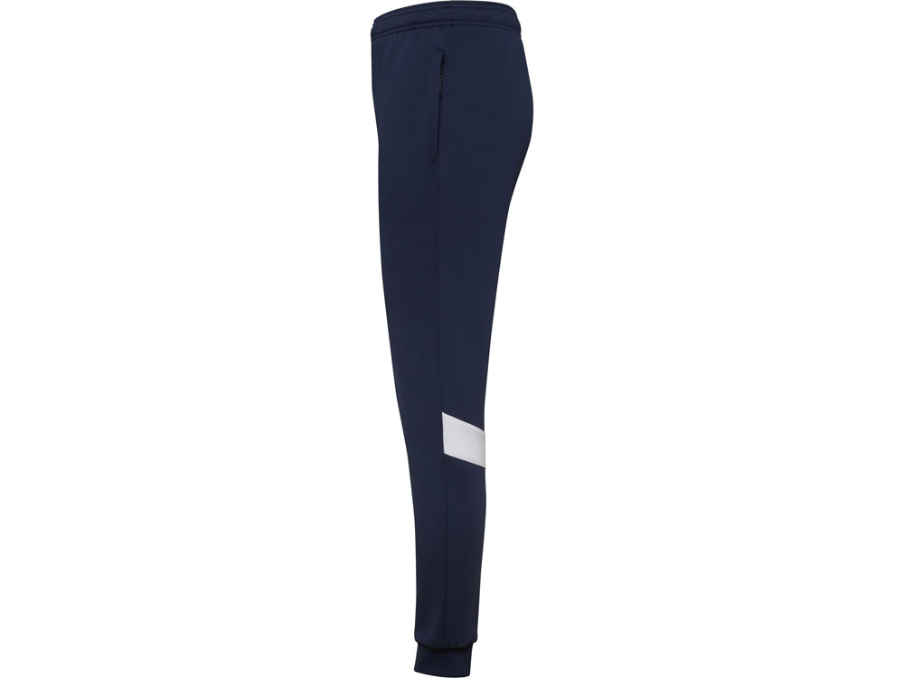 Спортивные брюки с эластичным поясом и шнурком. Боковые карманы закрываются на молнию. Контрастные лампасы белого цвета. Низ с манжетами из риба 1х1. Может быть с комбинирован с курткой Leros.