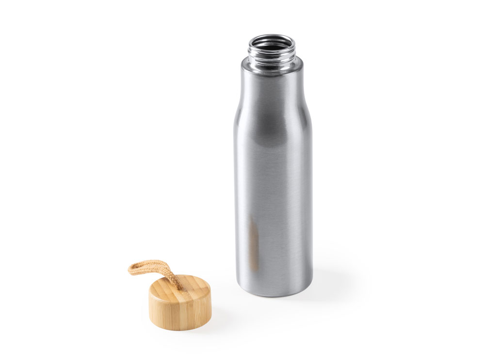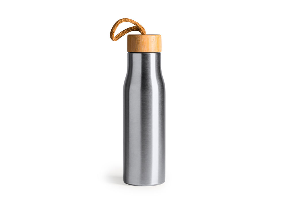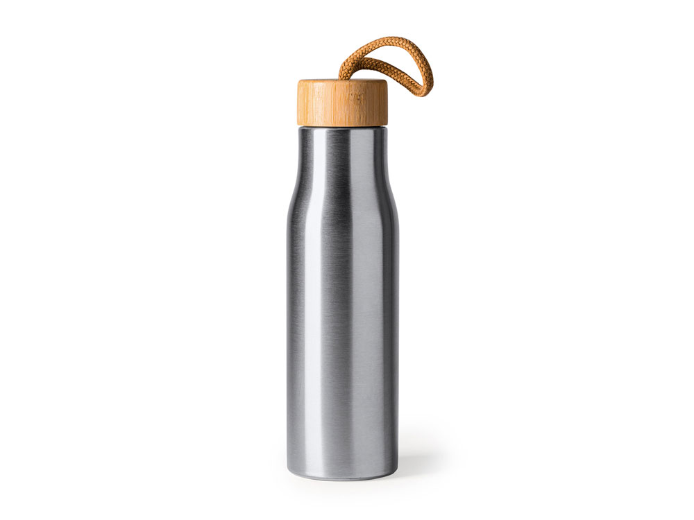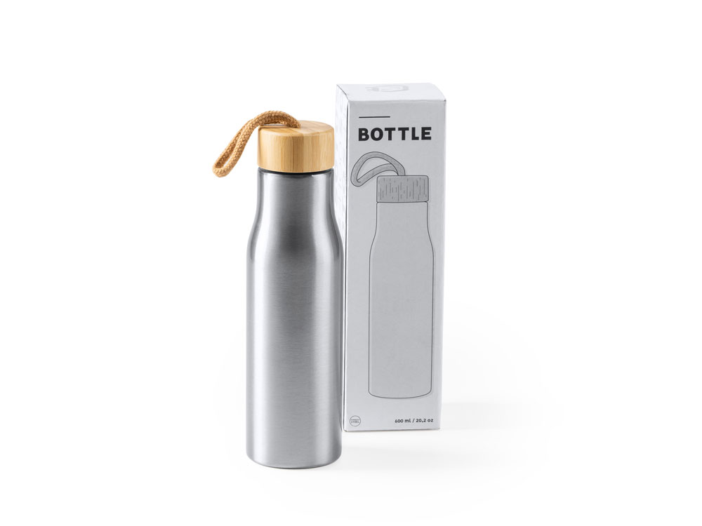 Бутылка из нержавеющей стали 304 с бамбуковой пробкой. В комплекте транспортировочный ремень. Объем 600 мл.