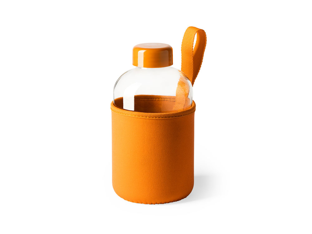 Стеклянная бутылка емкостью 600 мл. включает инновационный неопреновый чехол самых разных цветов с ручкой для переноски.