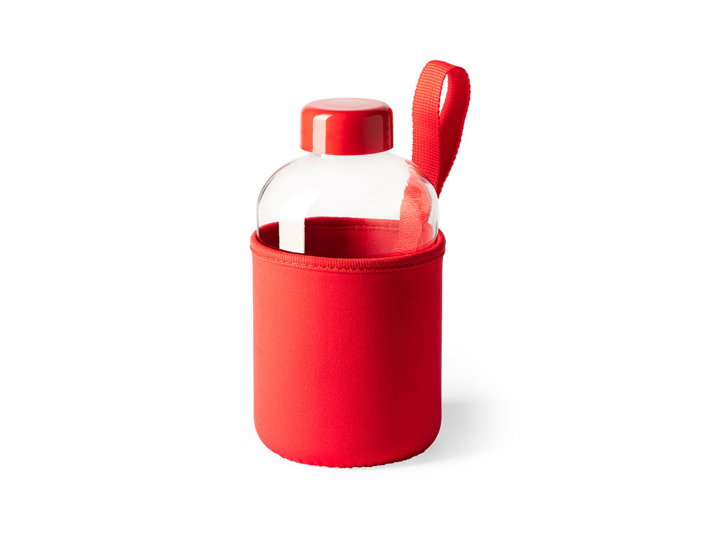 Стеклянная бутылка емкостью 600 мл. включает инновационный неопреновый чехол самых разных цветов с ручкой для переноски.