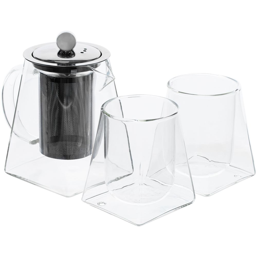 Материал чайник, стаканы - боросиликатное стекло; крышка и сито - нержавеющая сталь; коробка - переплетный картон