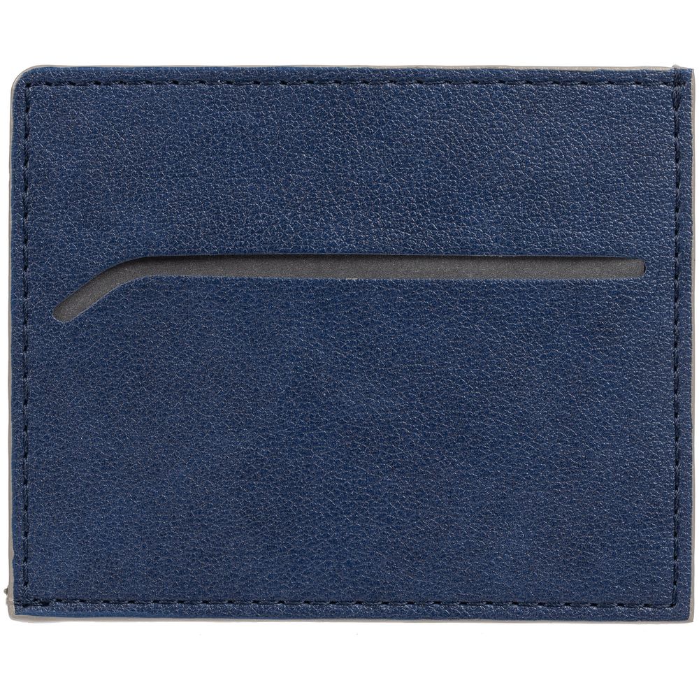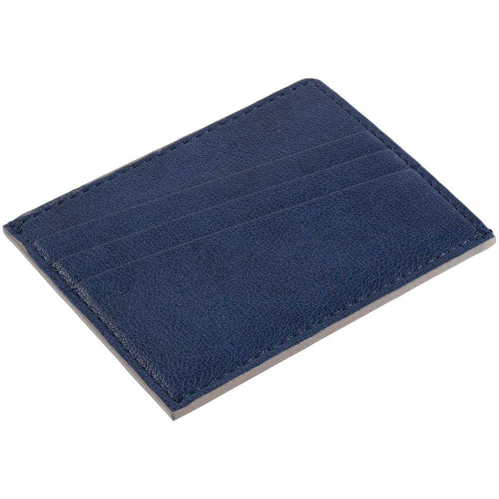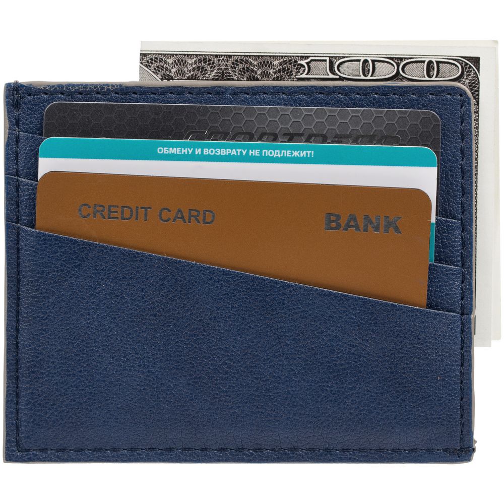 Чехол выполнен из материала Petrus, синий НН, дополнен окрашенным срезом края и внутренним карманом из серого картона. Имеет 4 отделения для кредитных карт и 1 отделение для купюр.