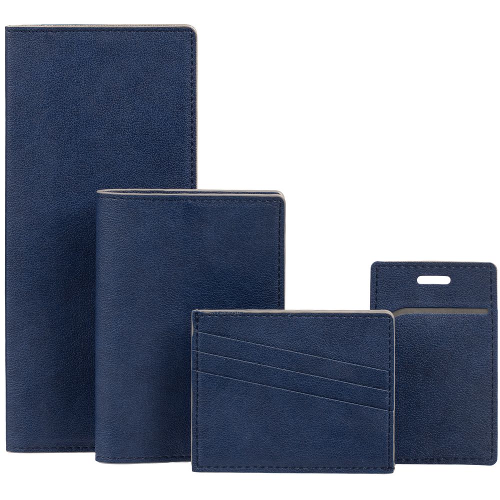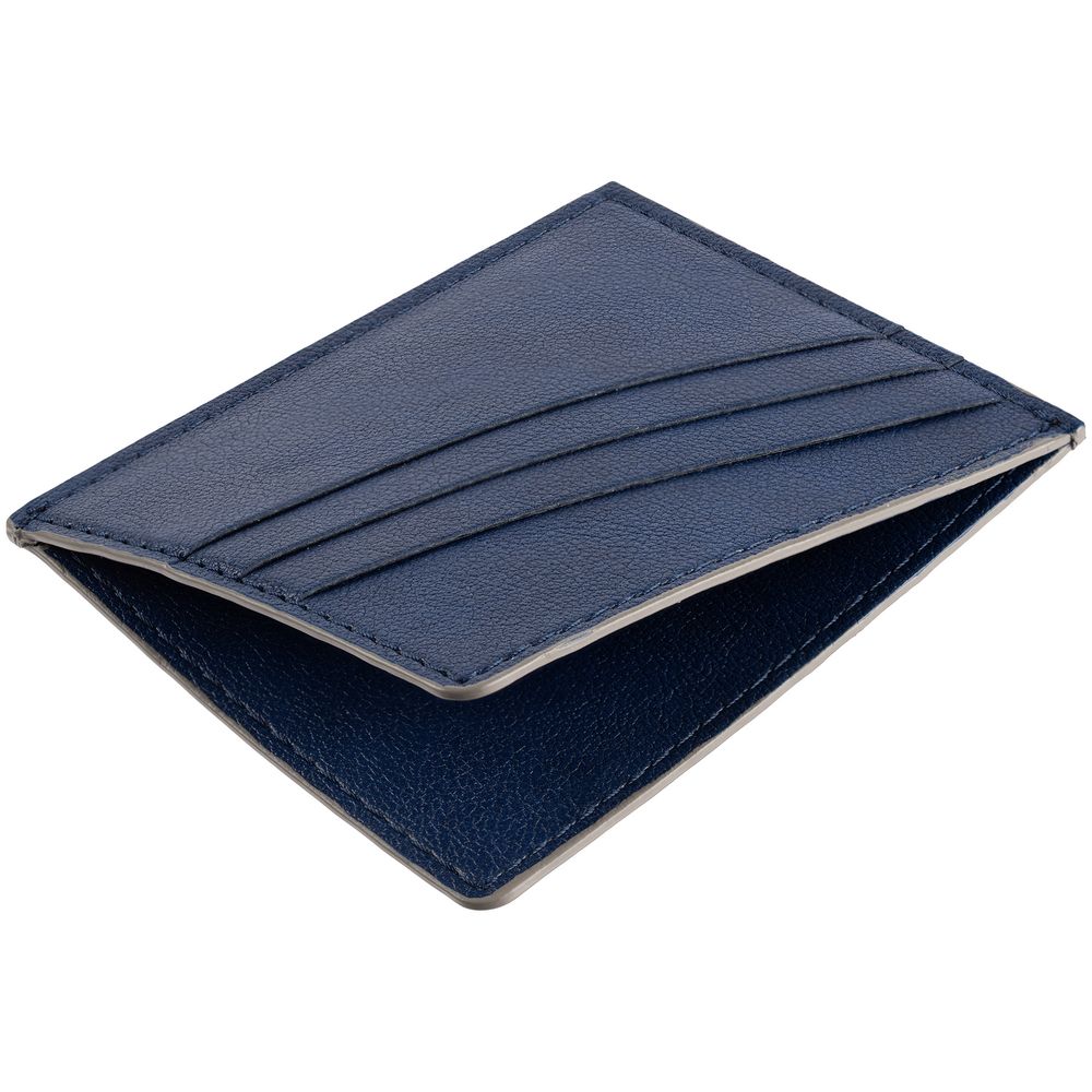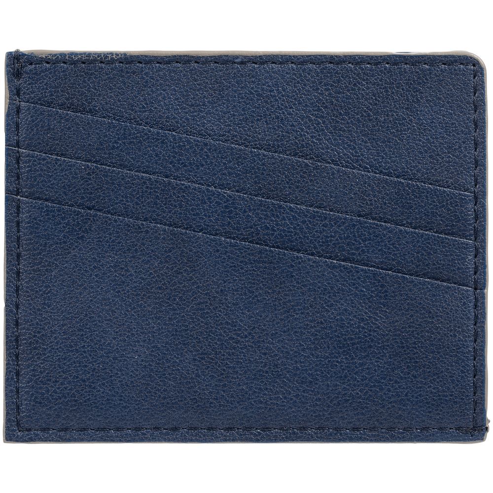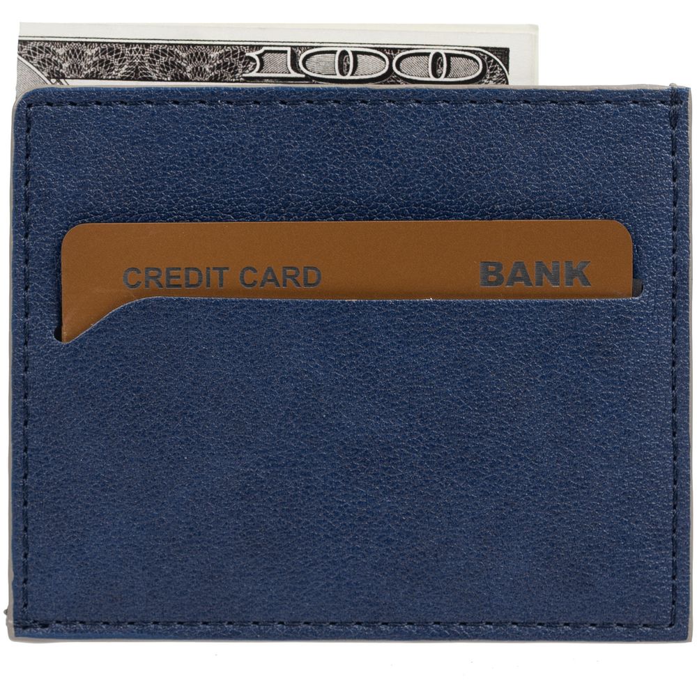 Чехол выполнен из материала Petrus, синий НН, дополнен окрашенным срезом края и внутренним карманом из серого картона. Имеет 4 отделения для кредитных карт и 1 отделение для купюр.