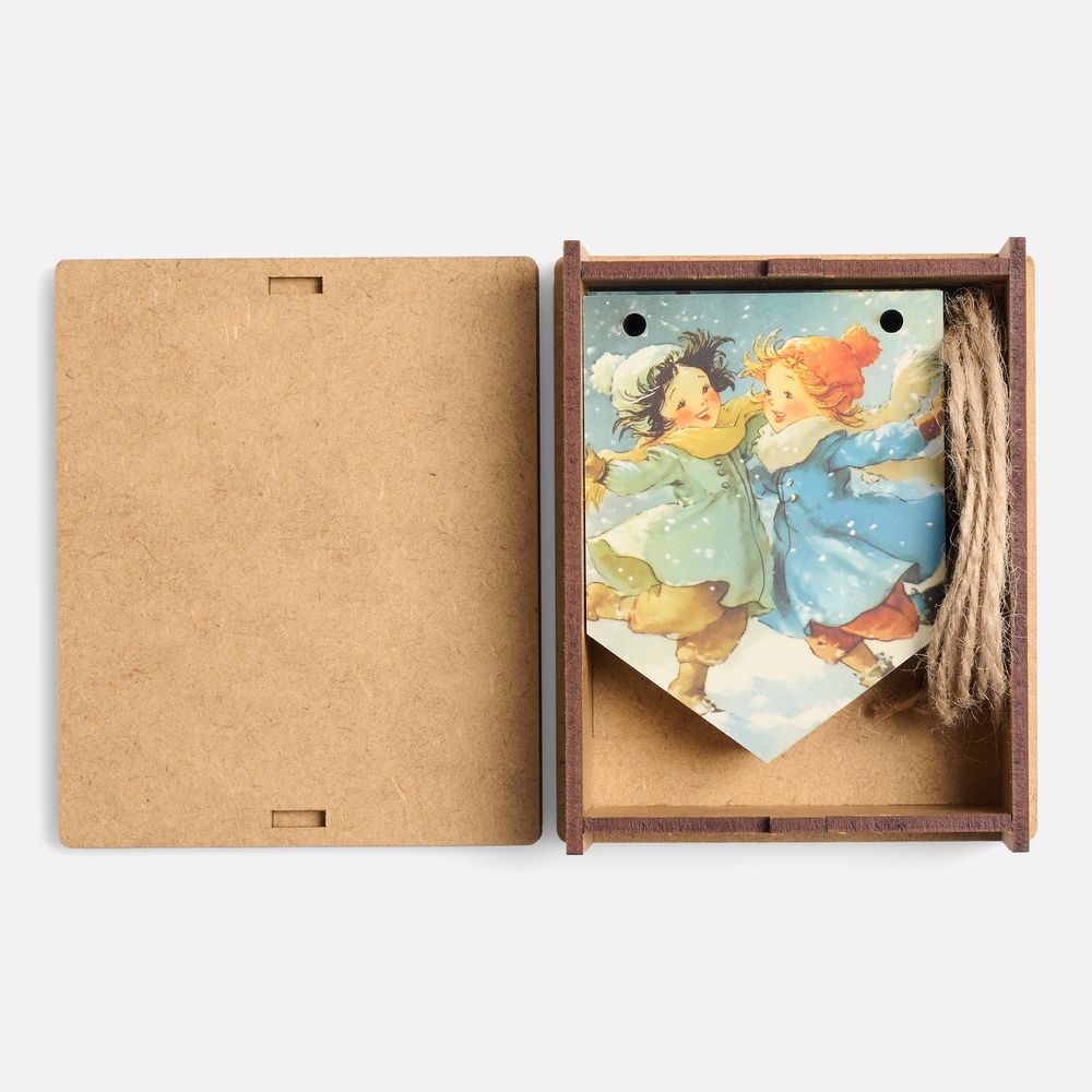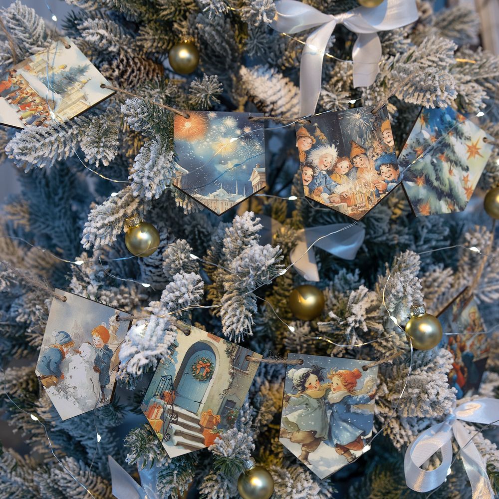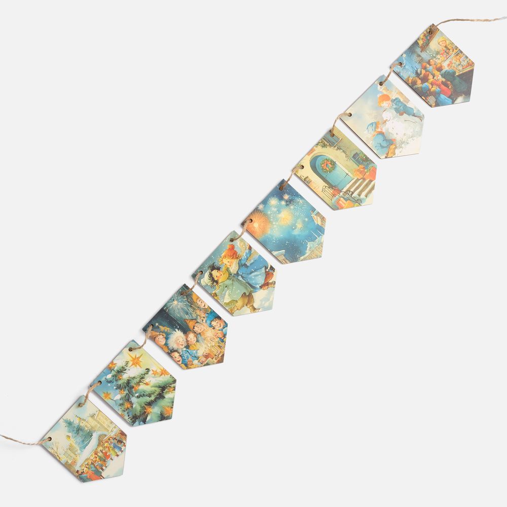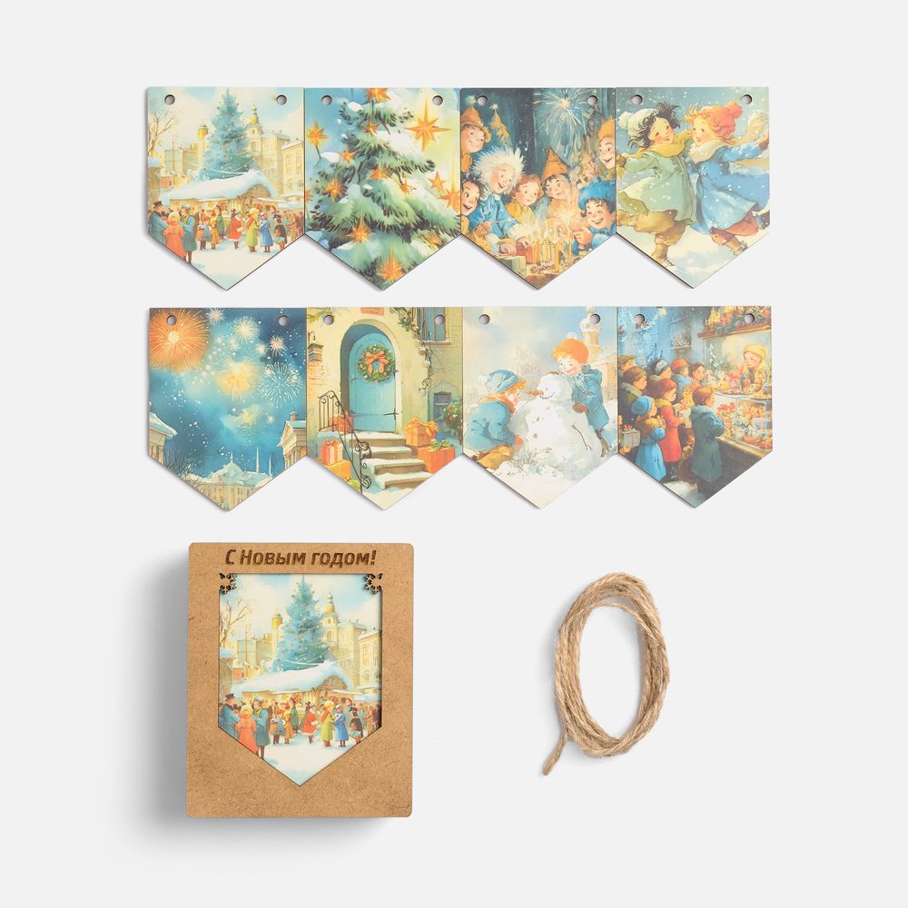 Очаровательная гирлянда из деревянных флажков с винтажными рождественскими иллюстрациями для создания уютной праздничной атмосферы дома или в офисе. Каждый флажок украшен теплым, душевным сюжетом — будто сошедшим со старинных открыток. Они с легкостью перенесут в мир новогодних сказок и детских фантазий — туда, где и хочется оказаться в самое волшебное время года!