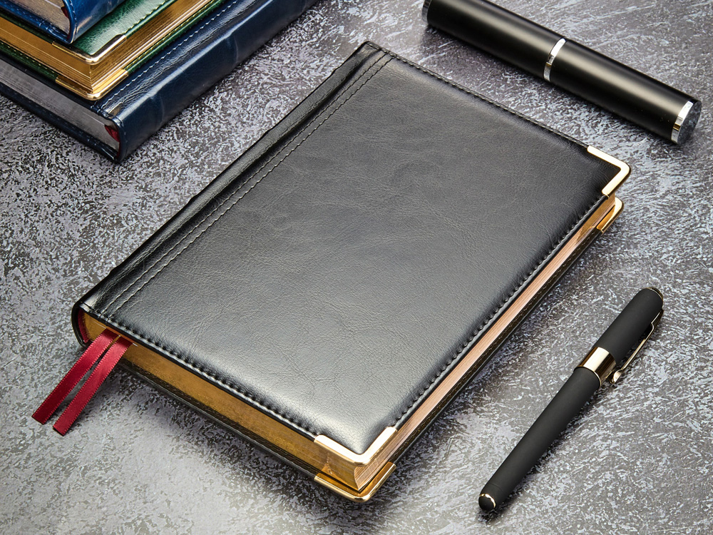 Полудатированный ежедневник Boss от бренда Bruno Visconti - это качественный корпоративный подарок по выгодной цене, произведенный специально под персонализацию. Представлен в универсальном формате А5 и состоит из 416 страниц. Классический деловой ежедневник линии Boss – образец элегантности. Гладкую тонкую фактуру экокожи подчеркивает декоративная строчка по контуру и металлические закругленные уголки золотистого цвета. В ежедневнике есть полезная справочная информация и телефонная книга, а также страницы для записи идей, мыслей и составления рабочих планов. Есть перфорация (нижние уголки отрывные). Для изготовления страниц используется качественный бежевый офсет повышенной плотности (80 г/кв м), которая производится японской фирмой Daiwa и подходит для всех видов чернил. Ежедневник можно персонализировать с помощью тиснения обложки - золотой или серебряной фольгой. Наши ежедневники помогут быть успешным и эффективным в карьере и повседневной жизни!