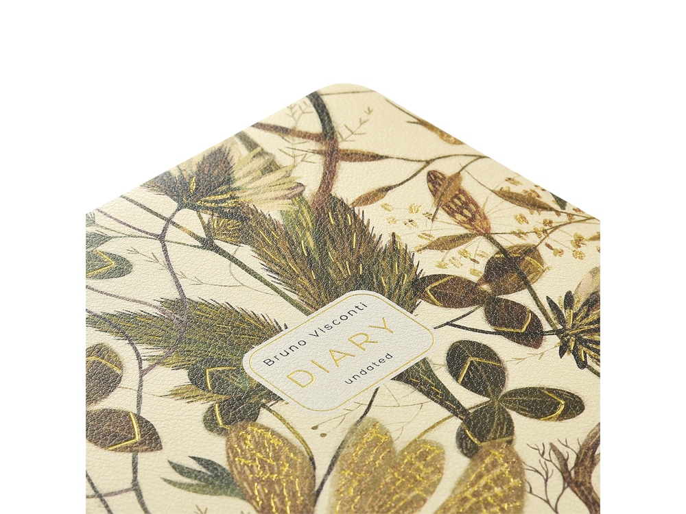 Недатированный ежедневник Summer Greens формата А5+ от Bruno Visconti для планирования рабочего времени, ведения записей. Твердая обложка ежедневника изготовлена из искусственной фактурной кожи. Ее яркий дизайн, созданный в коллаборации с художницей Кариной Кино, дополнен тиснением золотой фольгой в сочетании с цветным обрезом привлекает внимание, придает ежедневнику особую статусность. Внутренний блок изготовлен из бежевой бумаги плотностью 70 г/кв.м и содержит 120 листов в линейку. Для быстрой навигации предусмотрено желтое ляссе в цвет обложки шириной 7 мм – легко можно найти нужную страницу. Ежедневник Summer Greens - идеальное решение для динамичных деловых людей, которым важны мобильность, качество, комфорт, а также для креативных людей, стремящихся подчеркнуть свою индивидуальность яркими деловыми аксессуарами.