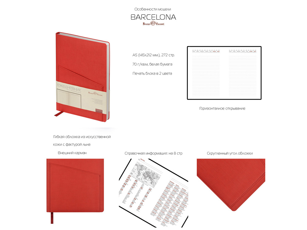 Это ежедневник предназначен для тех, кто отдает предпочтение строгости. Телефон, ручка, визитки и листы для записей будут всегда под рукой благодаря удобному карману на фронтальной стороне. В недатированном ежедневнике Barcelona черного цвета используется белая бумага плотность 70 г/м. Ляссе благородного бордового цвета сочетается с обложкой. Скругленный угол - фирменная особенность ежедневников Bruno Visconti. Справочная информация на 8 страницах. Ежедневник Barcelona упаковывается в картонный полукороб и термопленку.