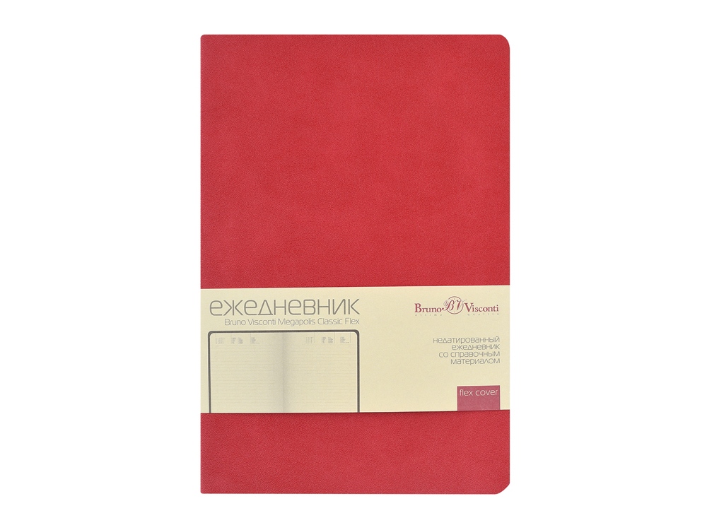 Классическое воплощение минимализма: формат А5, гибкая обложка, скругленный угол блока и обложки, ровные, четкие линии, отсутствие декоративных элементов. Внутренний блок изготовлен из бежевой бумаги плотностью 70 г/м2 и, помимо раздела для планирования рабочего времени, включает в себя 12 страниц справочной информации. Функциональность и эргономичность — это то, что отличает недатированный ежедневник Megapolis Classic Flex ТМ Bruno Visconti от всех других ежедневников.