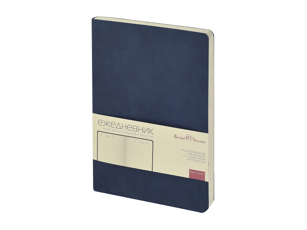 Классическое воплощение минимализма: формат А5, гибкая обложка, скругленный угол блока и обложки, ровные, четкие линии, отсутствие декоративных элементов. Внутренний блок изготовлен из бежевой бумаги плотностью 70 г/м2 и, помимо раздела для планирования рабочего времени, включает в себя 12 страниц справочной информации. Функциональность и эргономичность — это то, что отличает недатированный ежедневник Megapolis Classic Flex ТМ Bruno Visconti от всех других ежедневников.