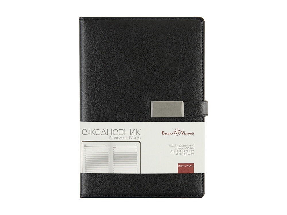 Казалось бы, утилитарный ежедневник Verona формата А5 со стандартным набором характеристик: петля для руки, ляссе в цвет обложки, скругленные углы блока и обложки. Но благодаря маленькой детали - металлическому хлястику на магните, ежедневник выглядит ярко и привлекательно. Ежедневник комфортно и приятно держать в руках благодаря поролонированной обложке из высококачественной искусственной кожи. Блок из 256 страниц ежедневника произведен из бежевой бумаги плотностью 80 г/кв.м, содержит помимо недатированных страниц для планирования рабочего времени еще и справочную информацию.