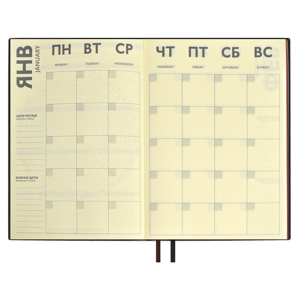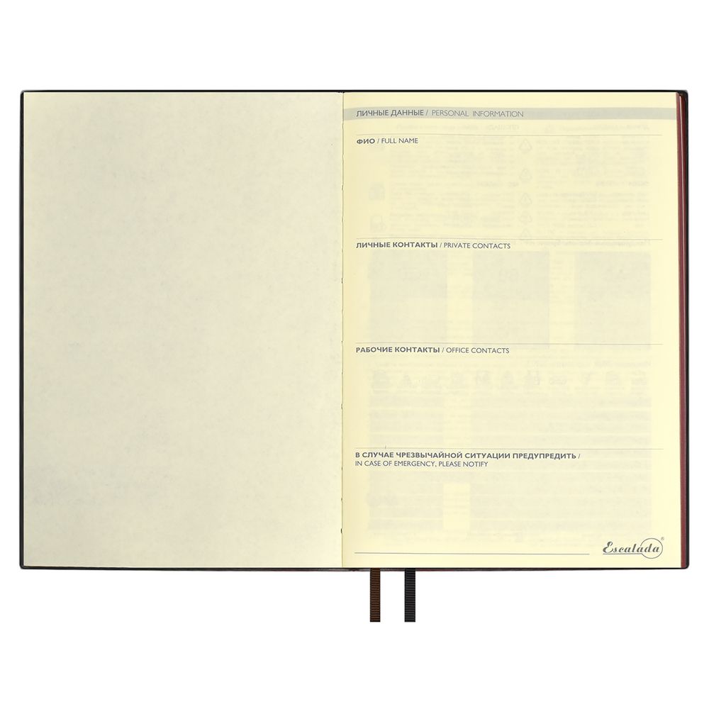 Ежедневник с гибкой обложкой и закладкой из искусственной кожи, дополнен капталом и двойным ляссе.