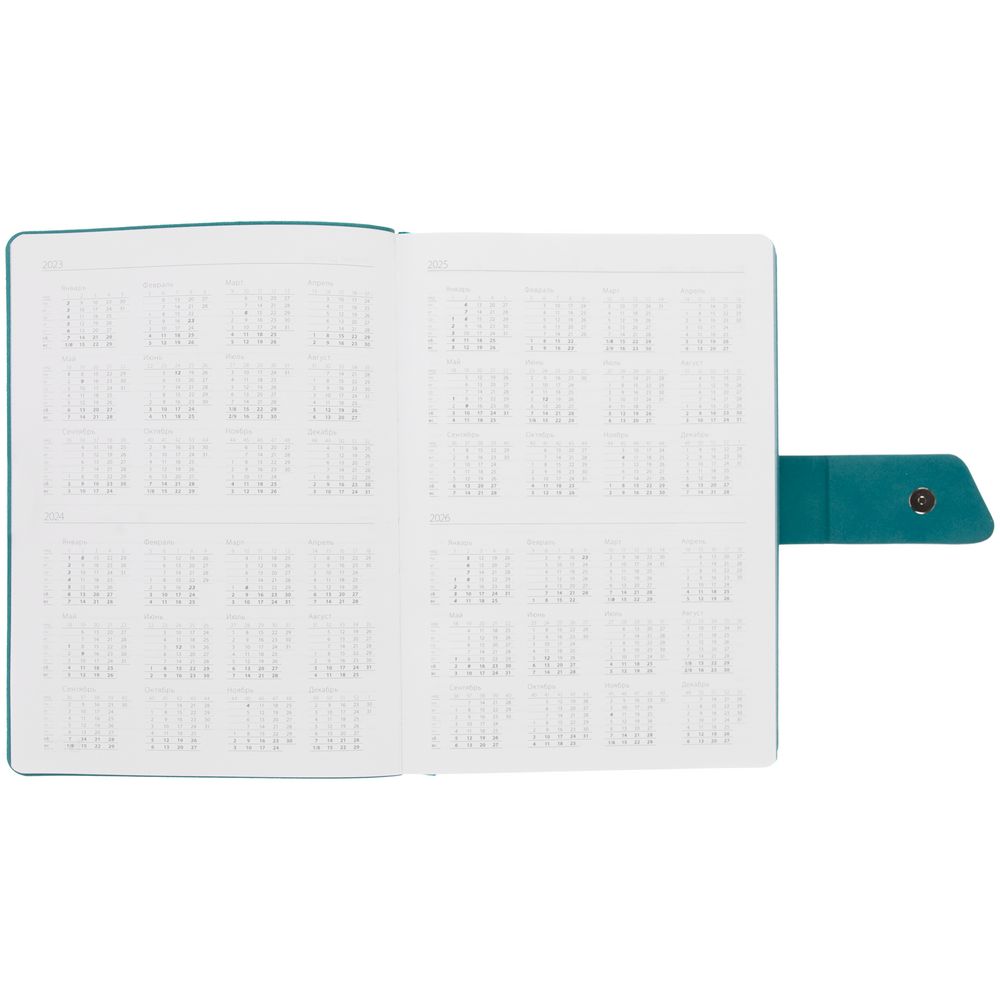 Ежедневник с гибкой обложкой, выполнен из материала La Fite, черный АА и Nubuck, цвет морской волны II, дополнен бирюзовым ляссе и хлястиком на кнопке.