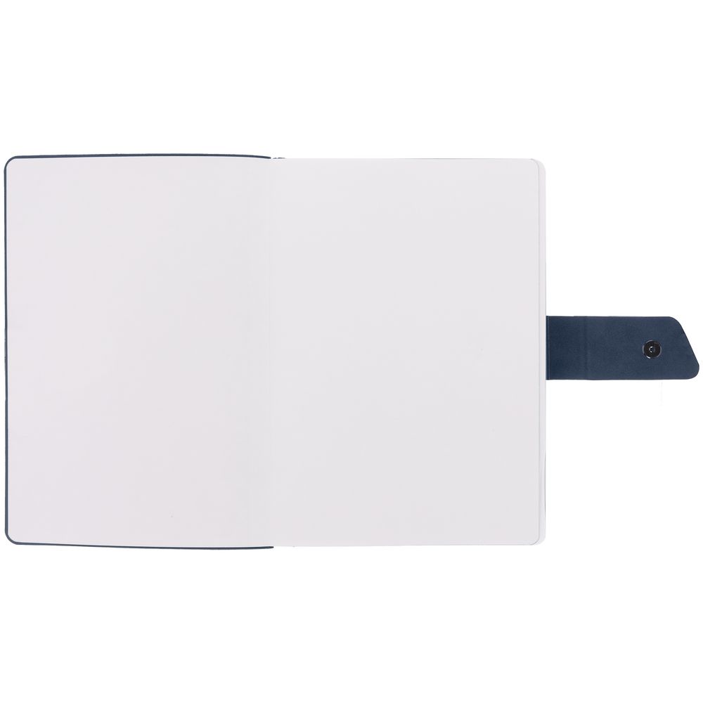 Ежедневник с гибкой обложкой, выполнен из материала La Fite, черный АА и Nubuck, темно-синий ХХ, дополнен синим ляссе и хлястиком на кнопке.