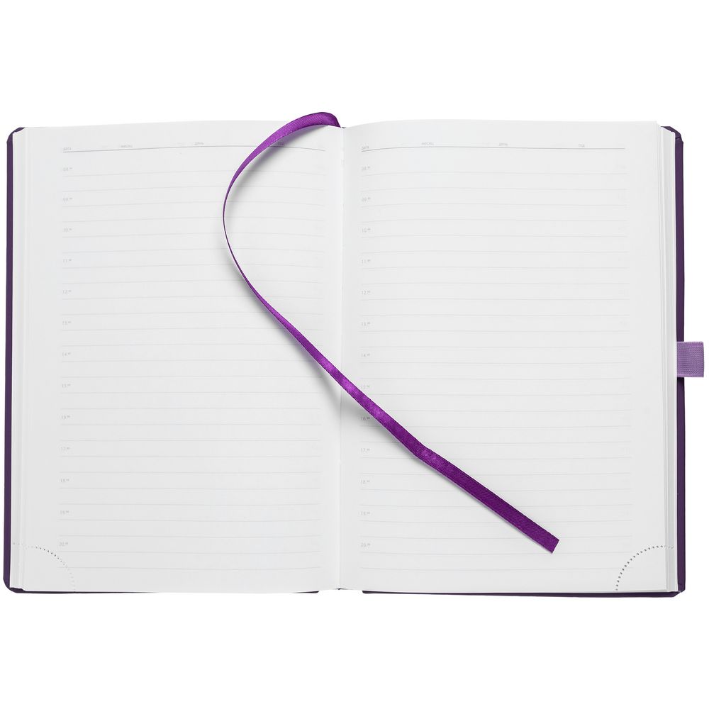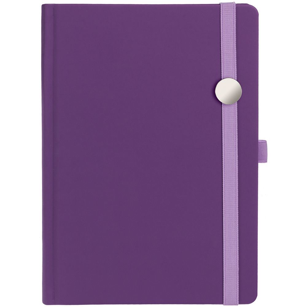 Ежедневник с твердой обложкой без поролона, выполнен из материала Soft Touch, фиолетовый UU, дополнен резинкой шириной 1 см, петлей-резинкой для ручки, капталом и ляссе в цвет обложки.
