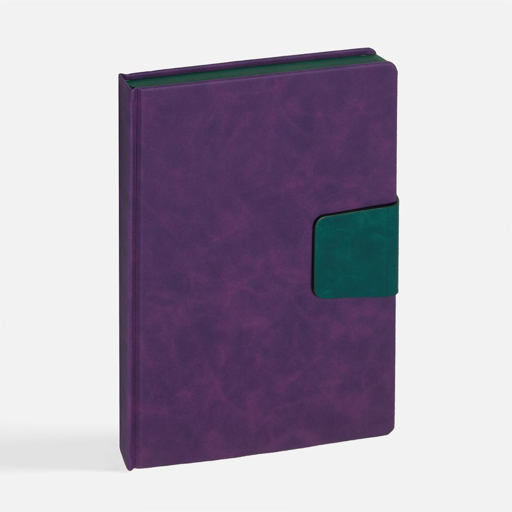 Ежедневник с твердой обложкой, выполнен из материала Nubuck Touch, фиолетовый UU, дополнен капталом, ляссе и обрезом синего цвета. Застежка — хлястик на магните из материала Nubuck Touch, темно-зеленый VV.