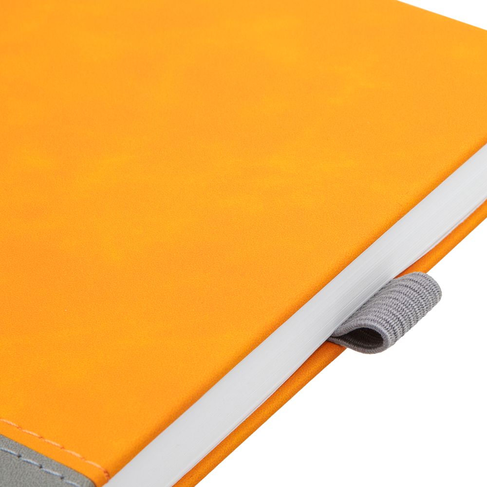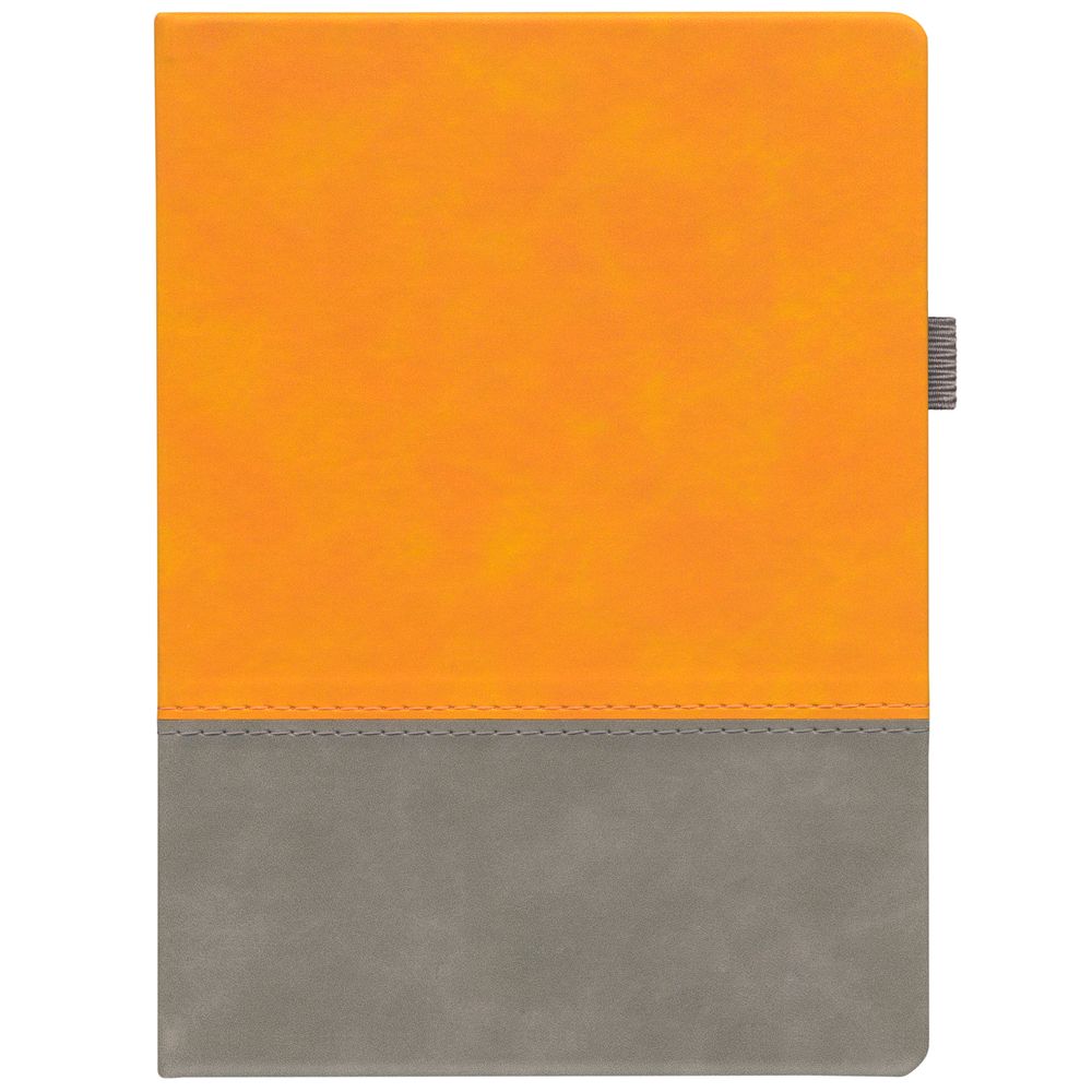 Ежедневник с твердой обложкой, без поролона, со сшивкой материалов Nubuck Touch, серый СС, и Nubuck Touch оранжевый ОО, дополнен двойным ляссе и петлей-резинкой для ручки.