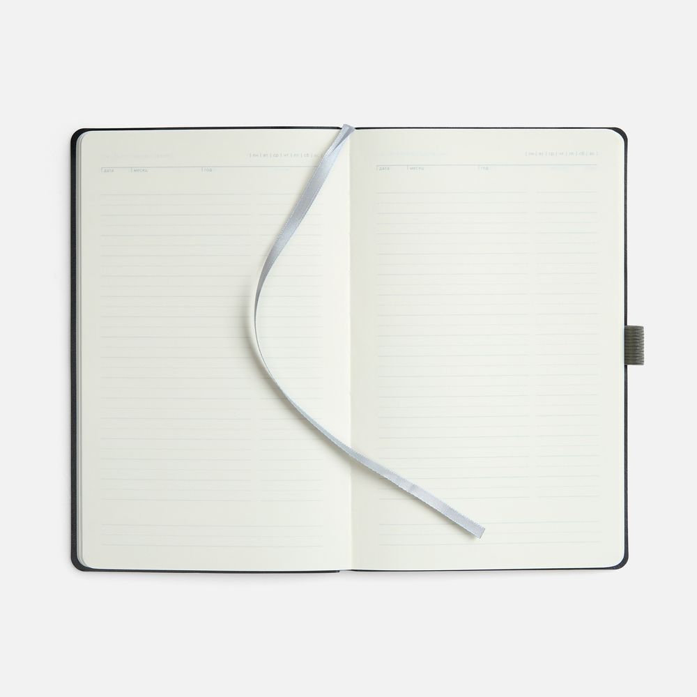Ежедневник с гибкой обложкой, выполнен из материала Espresso, дополнен цветными ляссе и петлей-резинкой для ручки.