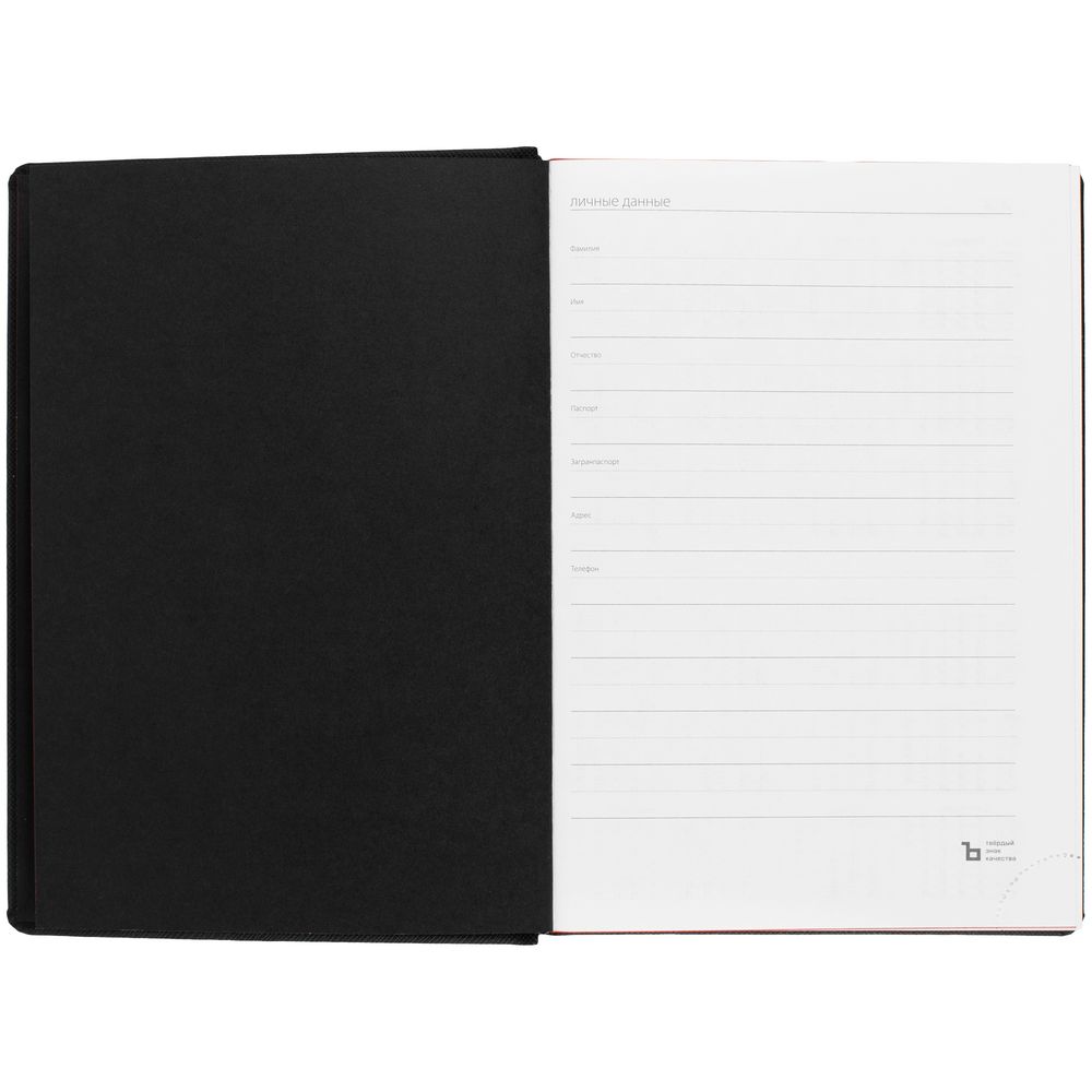 Твердая обложка выполнена из материалов Nice Touch, черный АА, и Canyon, красный РР. Ежедневник дополнен капталом, резинкой для ручки и ляссе черного цвета.