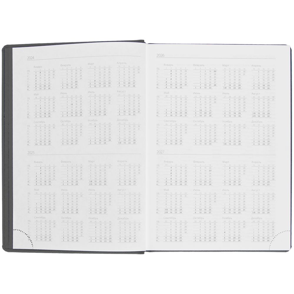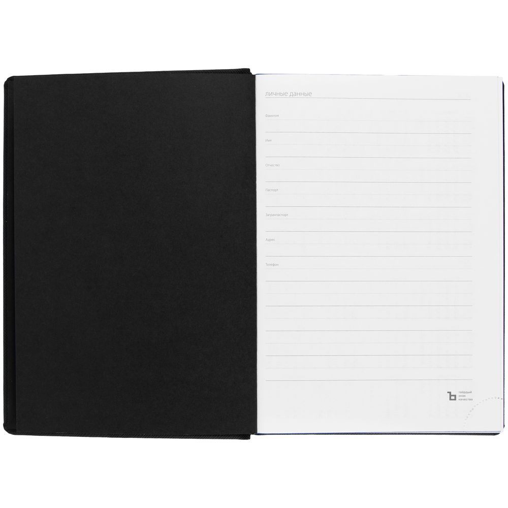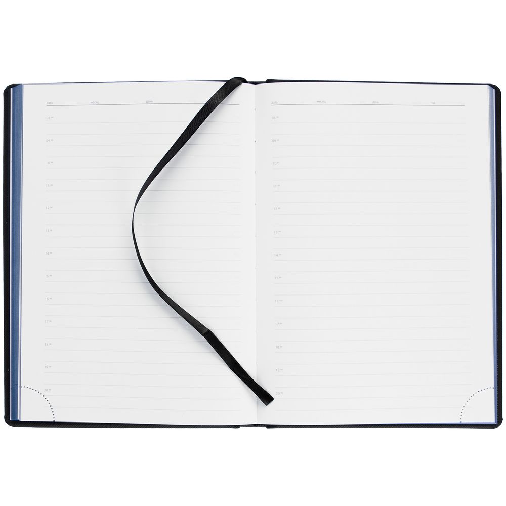 Твердая обложка выполнена из материалов Nice Touch, черный АА, и Canyon, синий НН. Ежедневник дополнен капталом, резинкой для ручки и ляссе черного цвета.