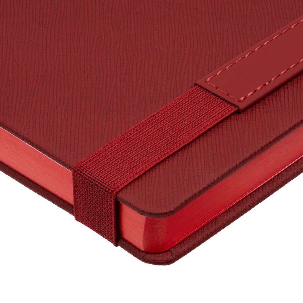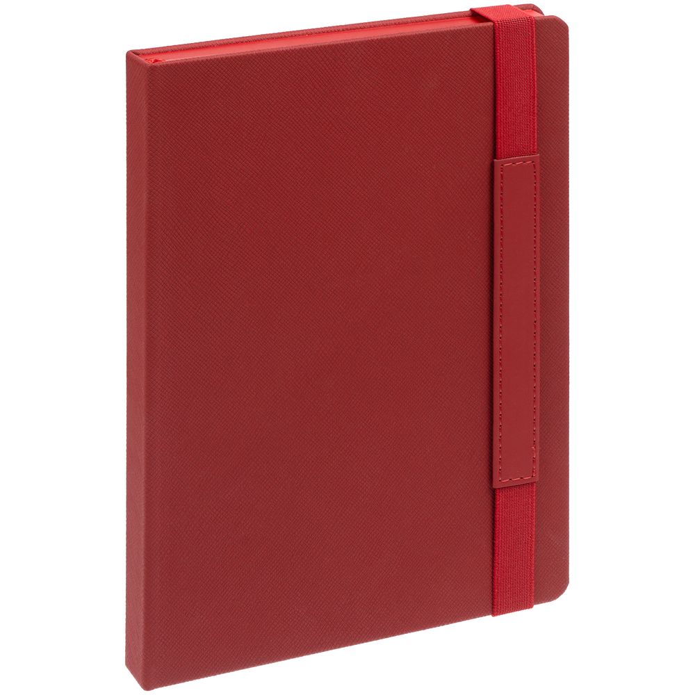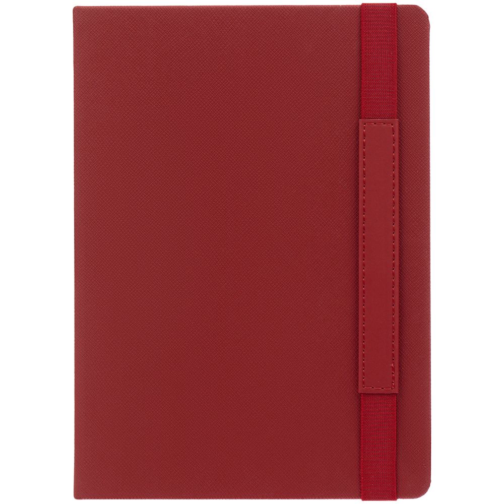 Ежедневник с твердой обложкой, выполнен из материала Nice Touch, красный РР, дополнен резинкой с лейблом из материала Soft Touch и ляссе в цвет обложки.