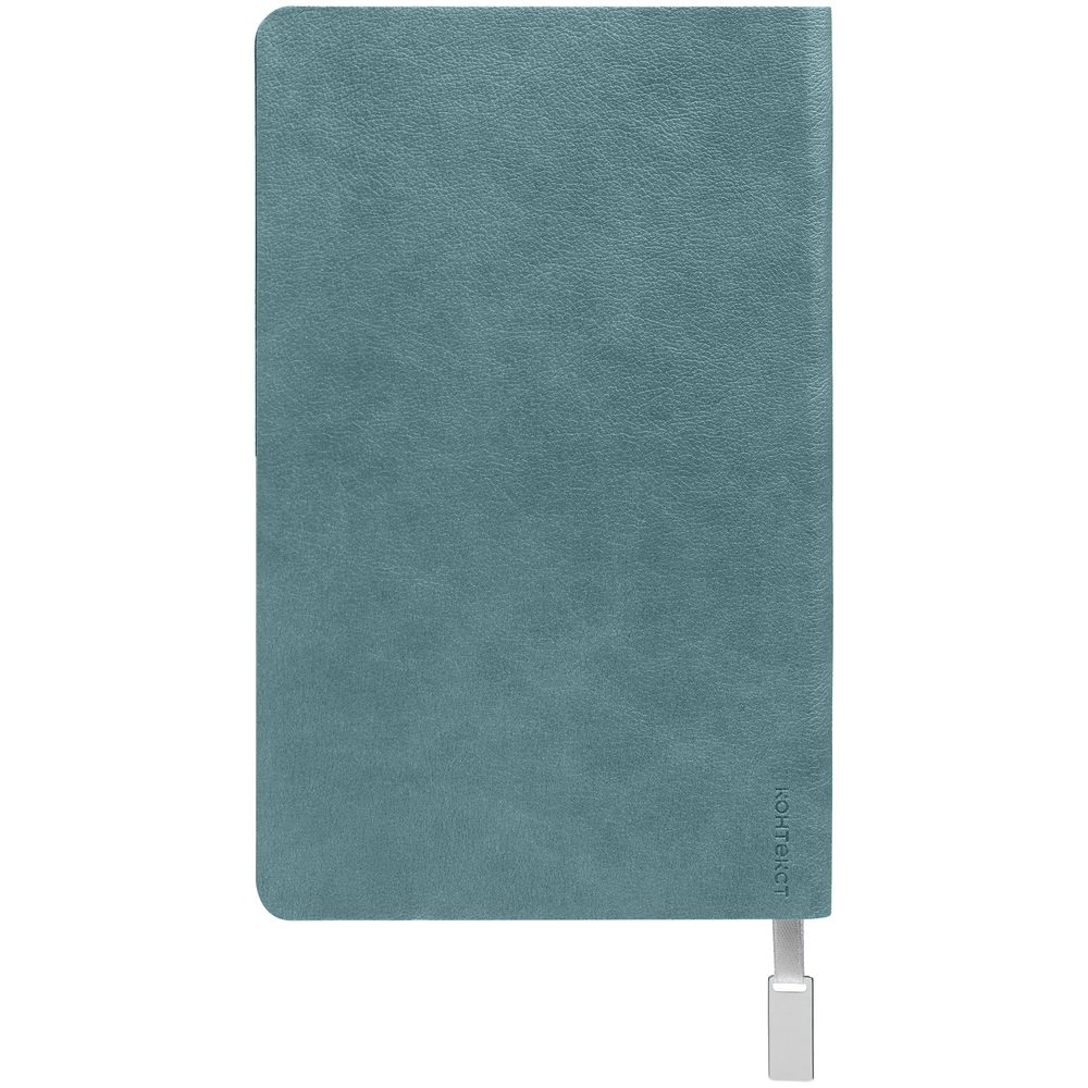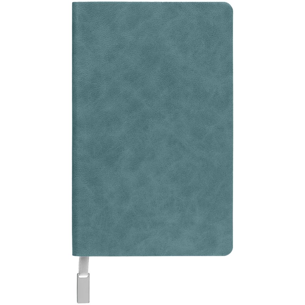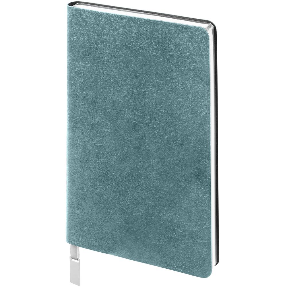 Ежедневник с гибкой обложкой, выполнен из материала Petrus, голубой JJ, дополнен серым ляссе с металлическим шильдиком.