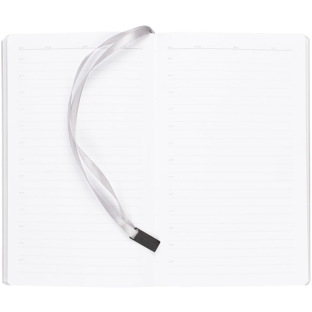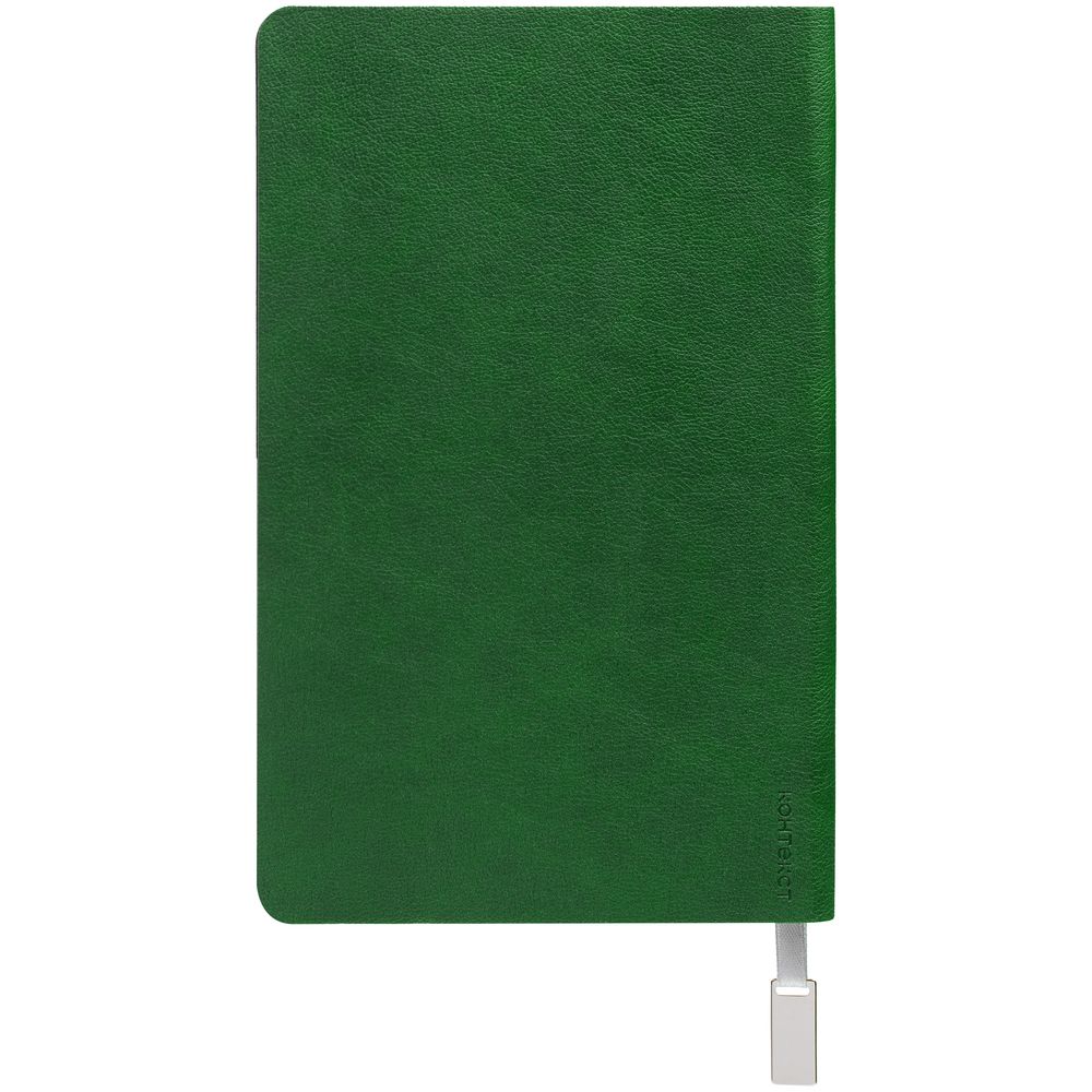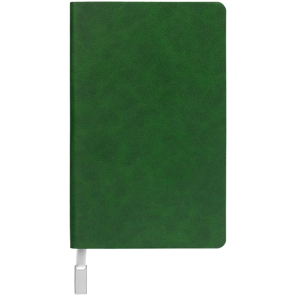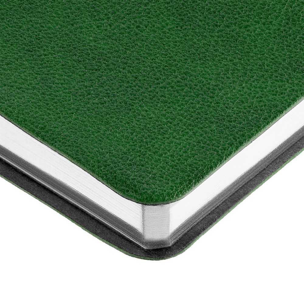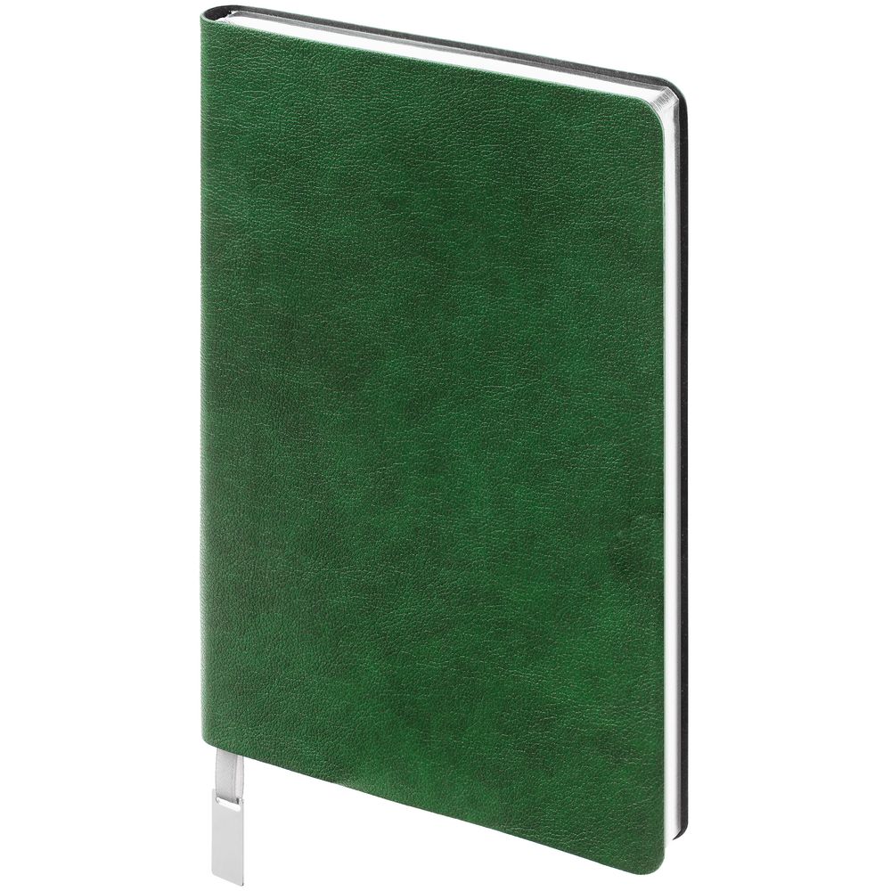 Ежедневник с гибкой обложкой, выполнен из материала Petrus, зеленый FF, дополнен серым ляссе с металлическим шильдиком.