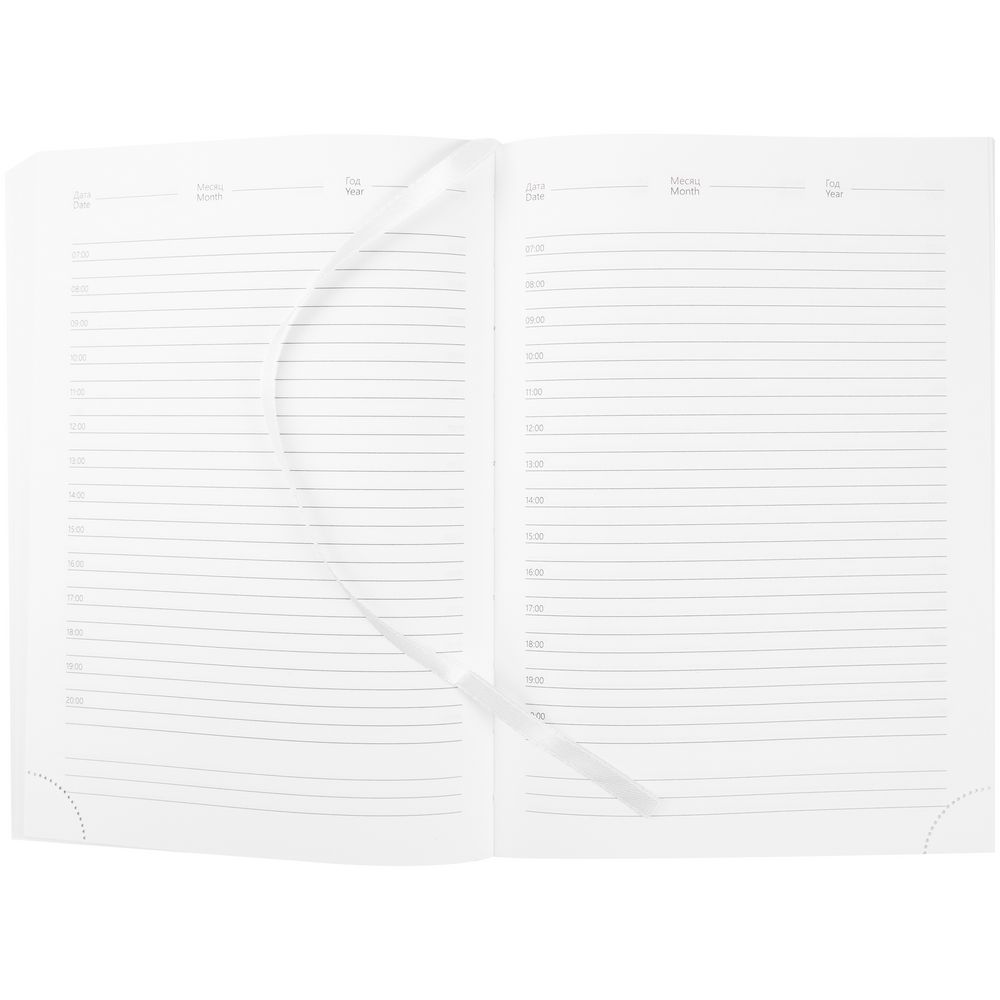 Ежедневник с твердой обложкой, выполнен из материала Waltz, белый ВВ, дополнен ляссе в цвет материала.
