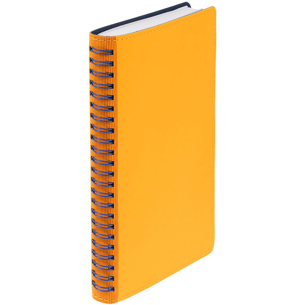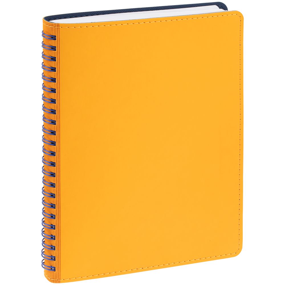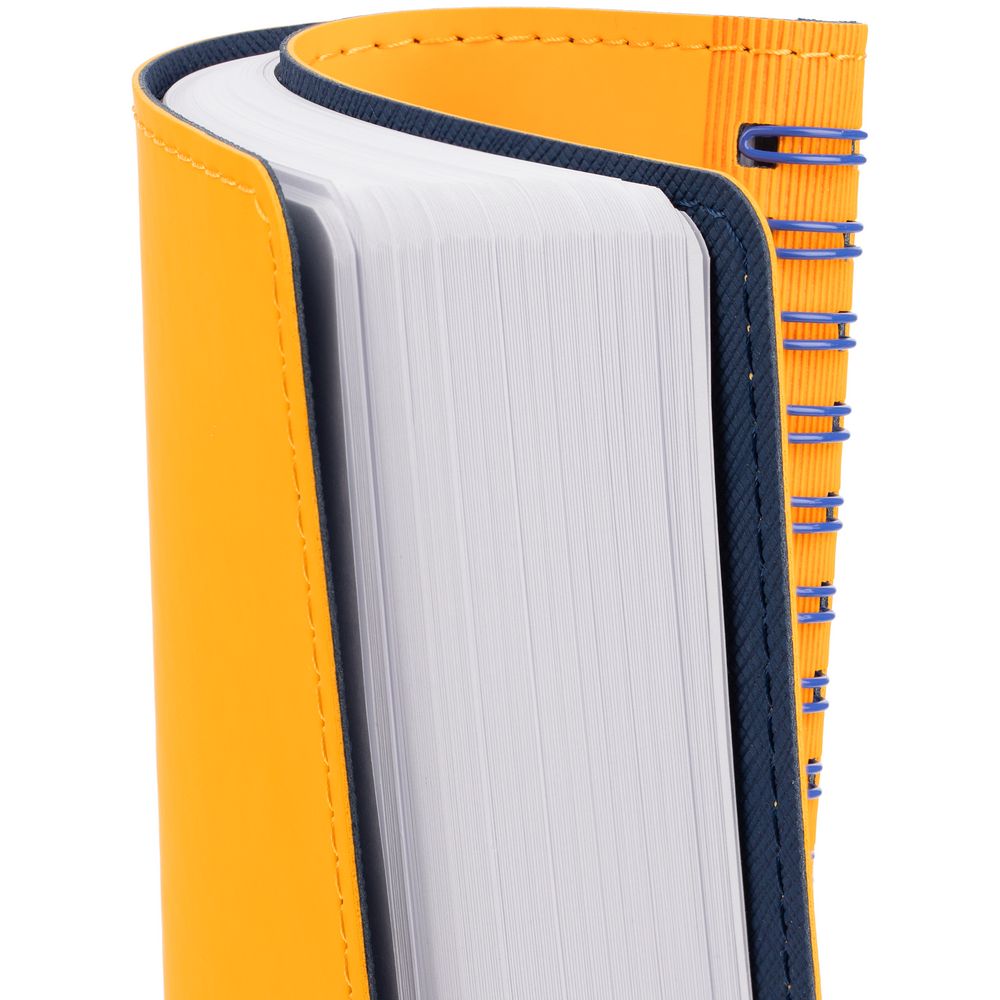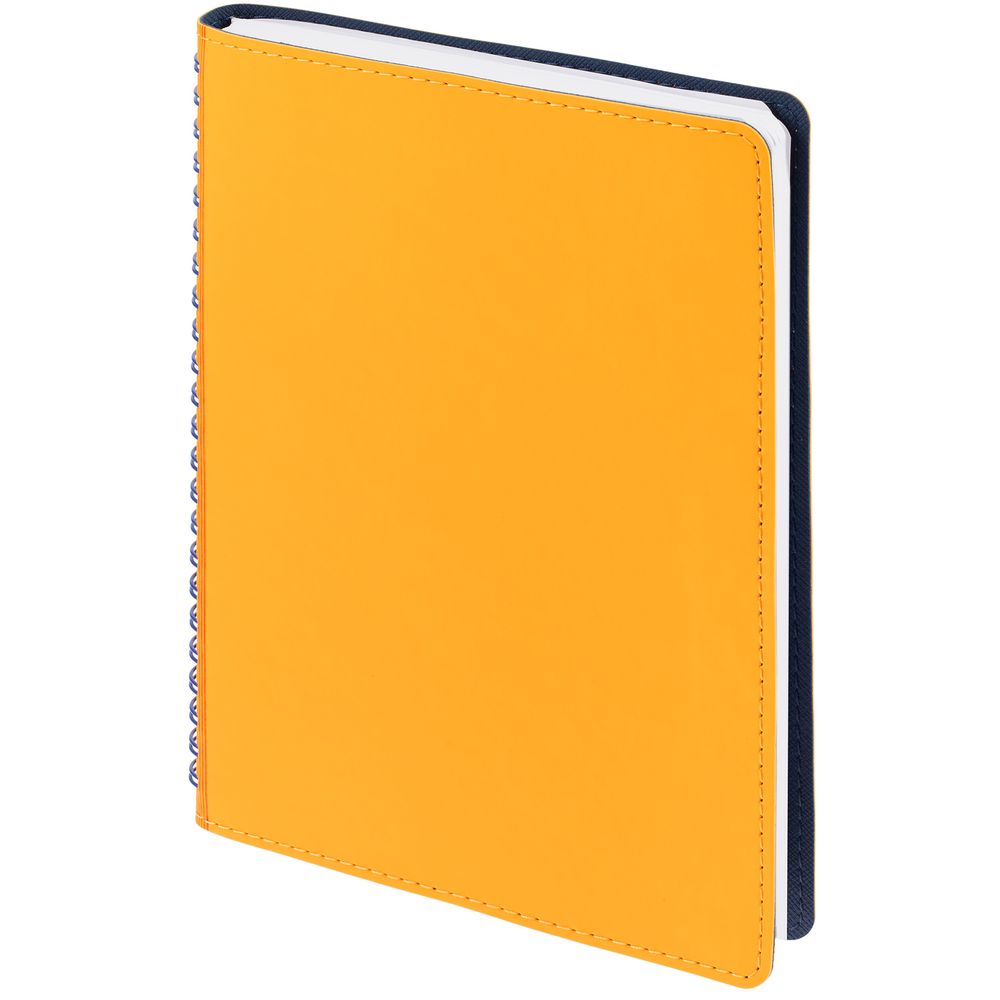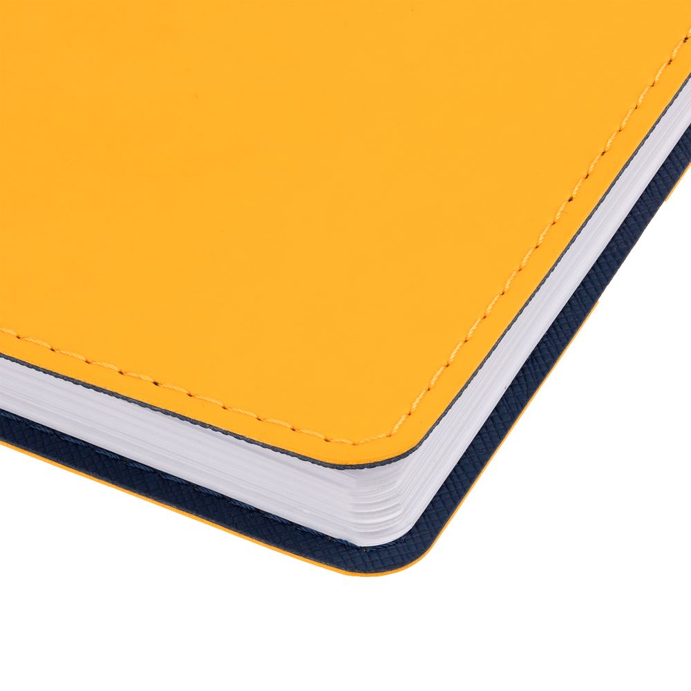 Ежедневник с гибкой обложкой, выполнен из материалов Soft Touch, желтый КК и Nice Touch, темно-синий ХХ.