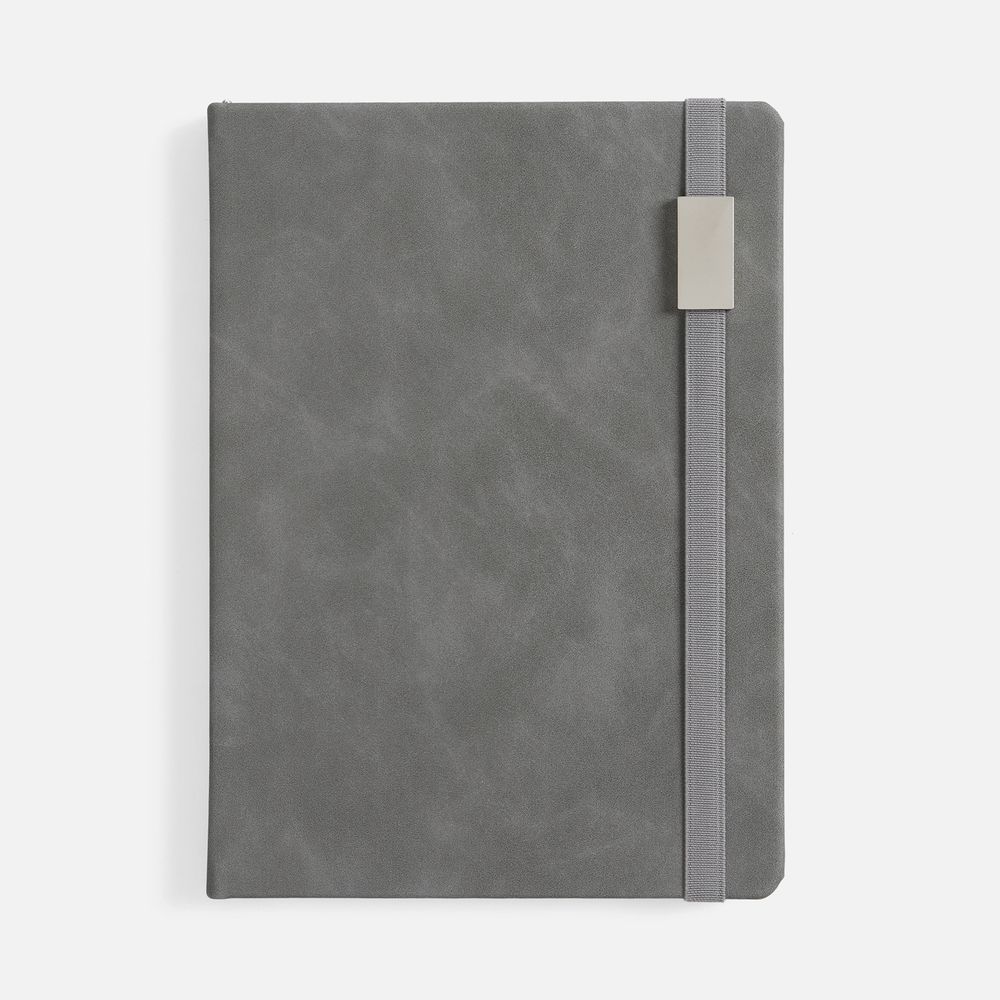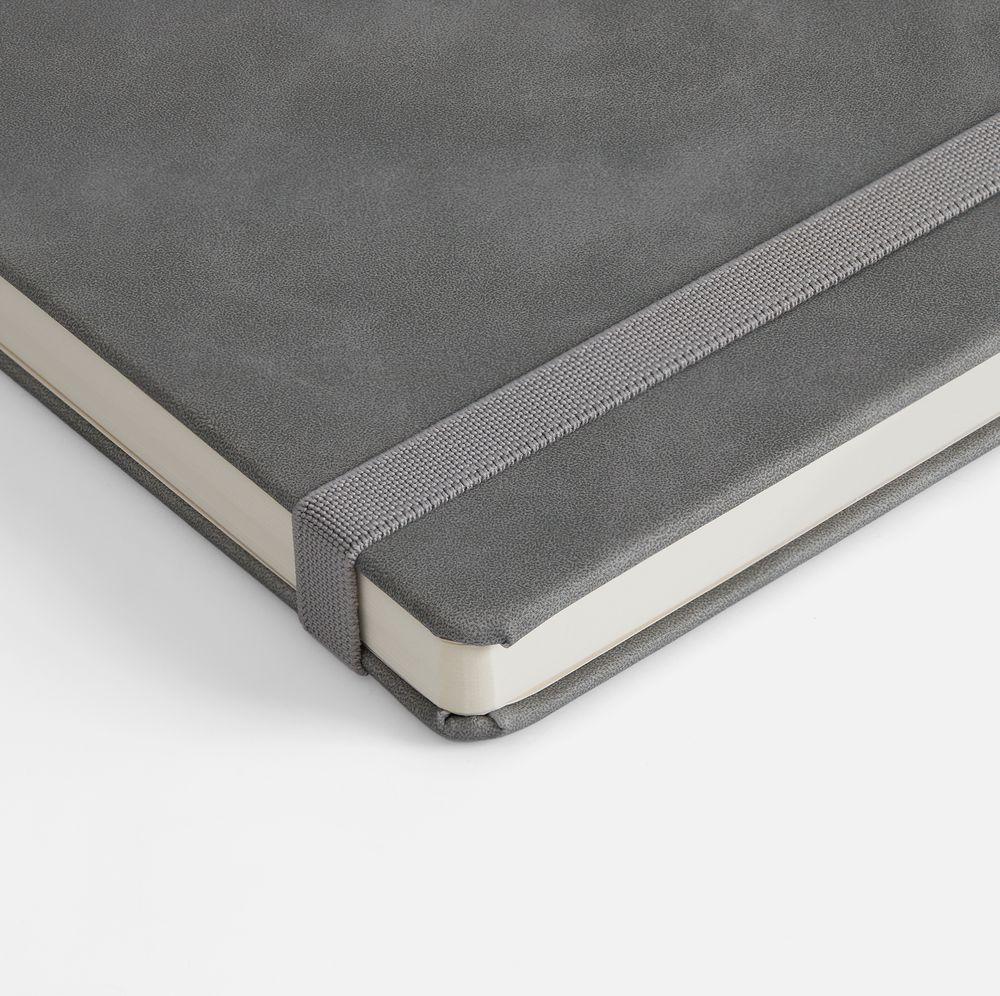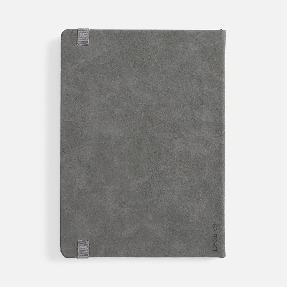 Ежедневник с твердой обложкой, выполнен из материала Nubuck Touch, серый СС, дополнен ляссе темно-серого цвета.