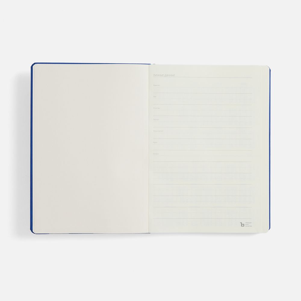 Ежедневник с твердой обложкой, выполнен из материала Nubuck Touch, темно-синий ХХ, дополнен ляссе темно-синего цвета.