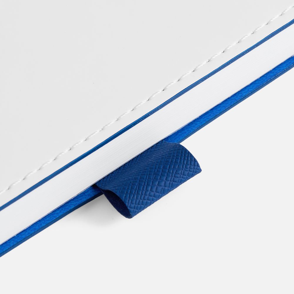 Гибкая обложка, материал обложки — Soft Touch, белый BB и Latte, синий НН; материал петли для ручки — Nice Touch, синий НН. Срез обложки окрашен в синий цвет.