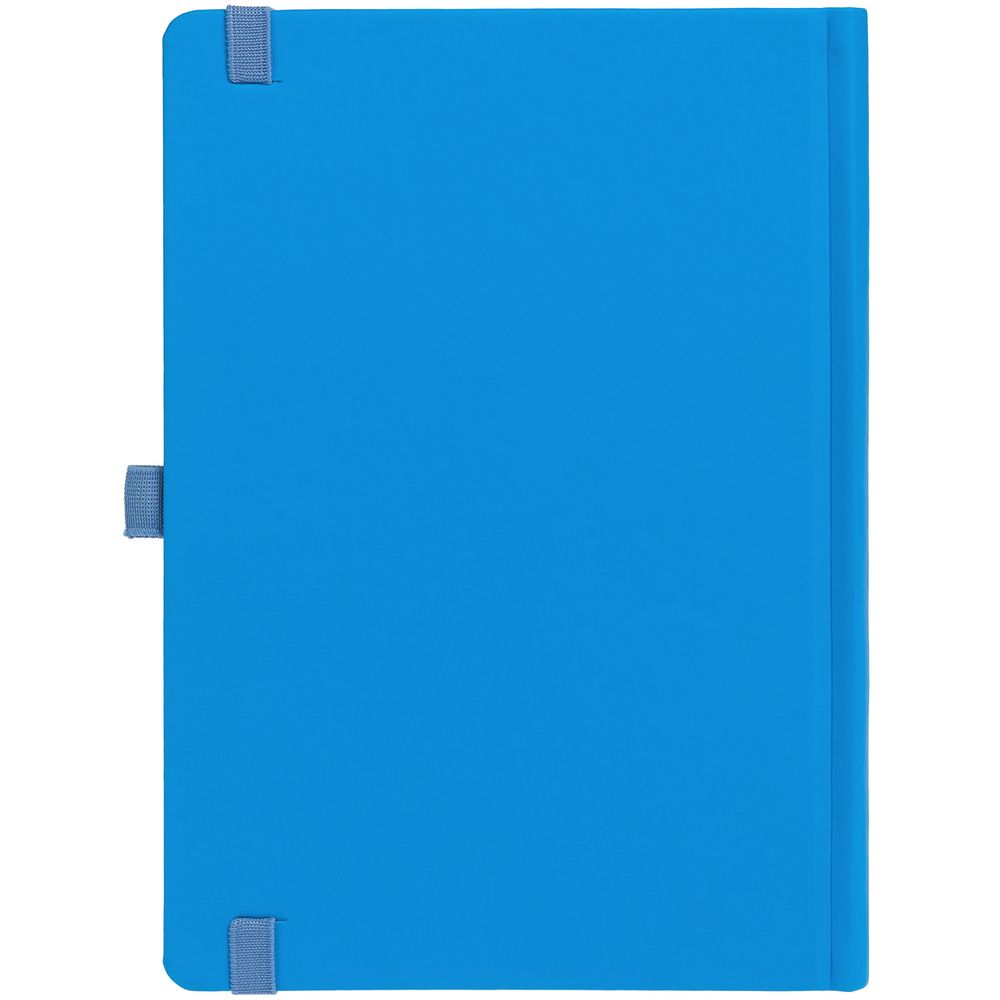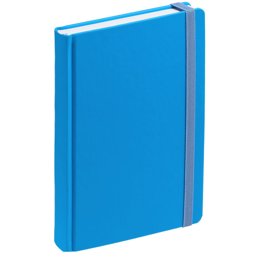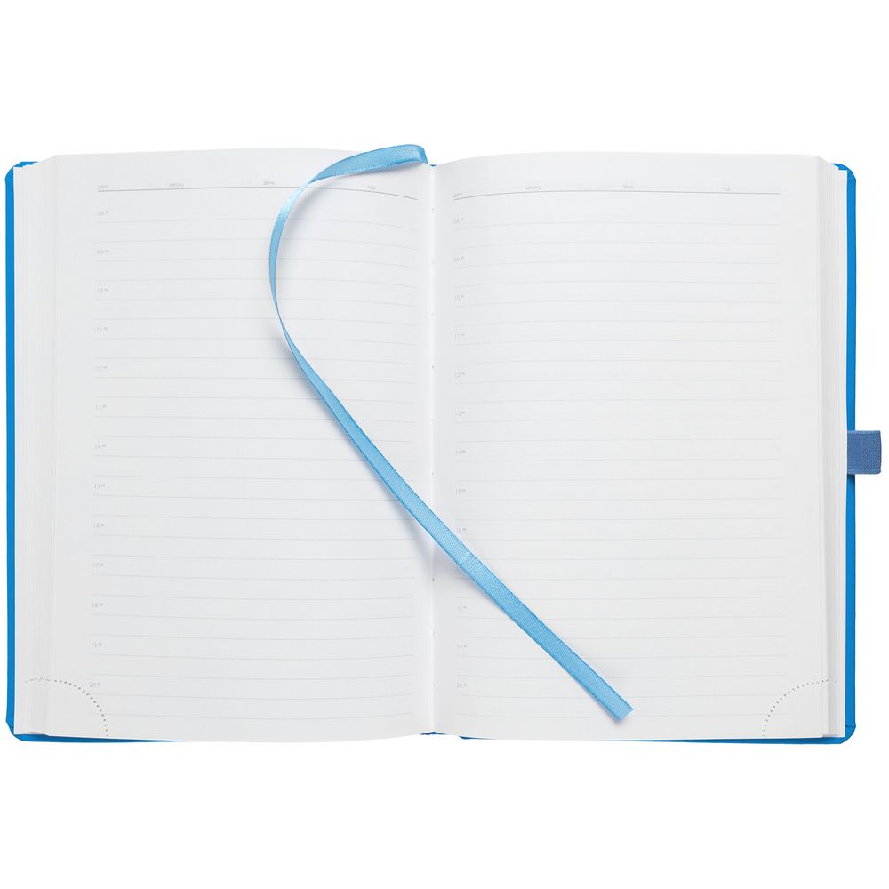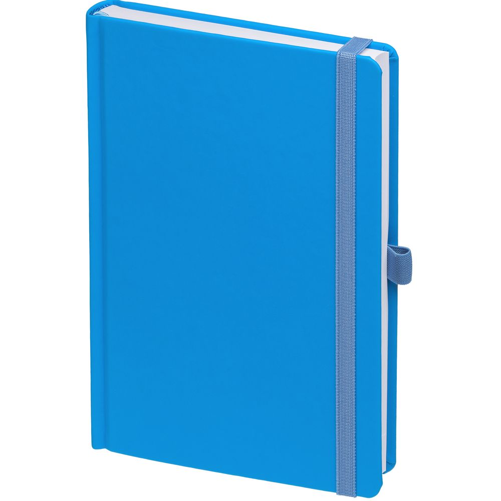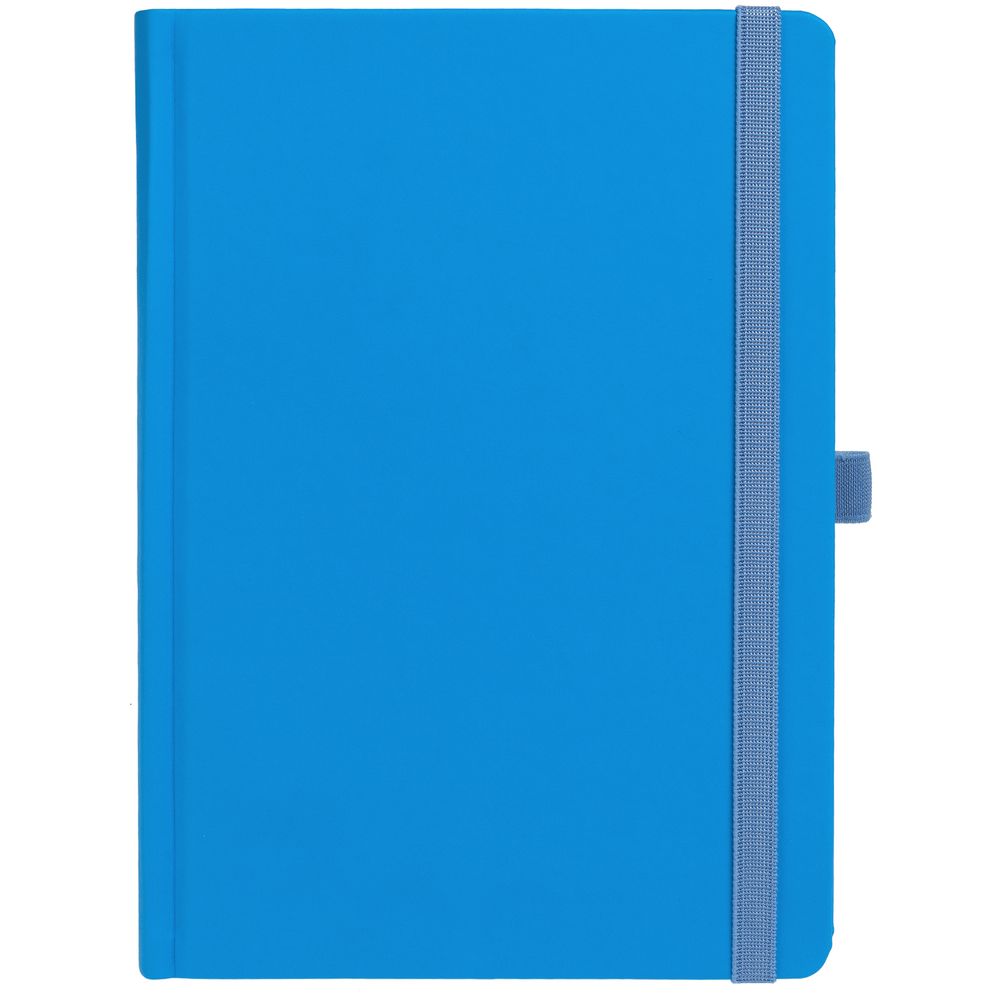 Ежедневник с твердой обложкой без поролона, выполнен из материала Soft Touch Ultra, голубой JJ, дополнен резинкой шириной 1 см, петлей-резинкой для ручки, капталом и ляссе голубого цвета.