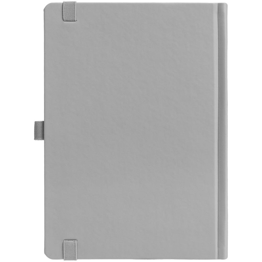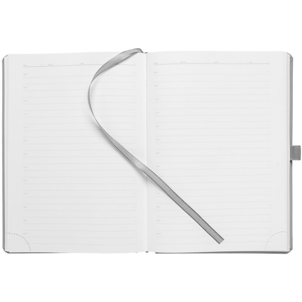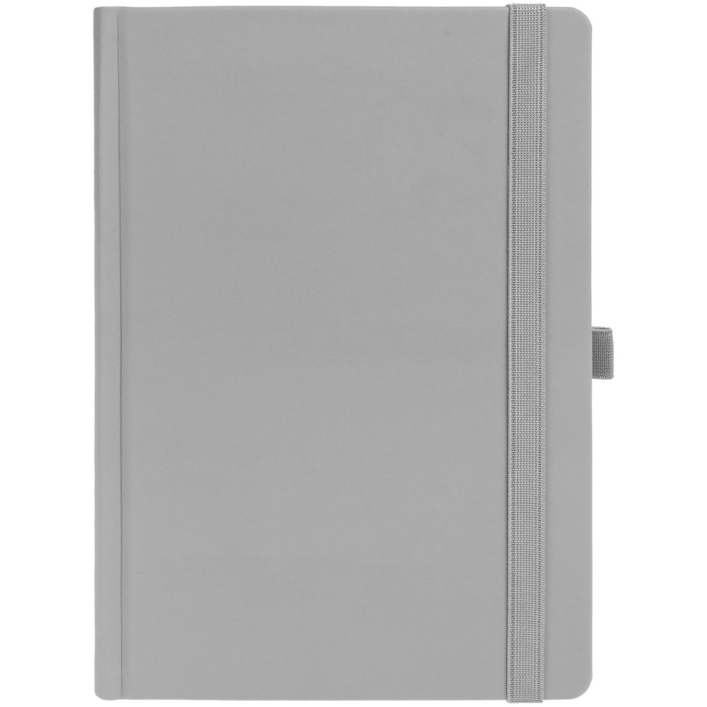 Ежедневник с твердой обложкой без поролона, выполнен из материала Soft Touch, серый СС, дополнен резинкой шириной 1 см, петлей-резинкой для ручки, капталом и ляссе серого цвета.