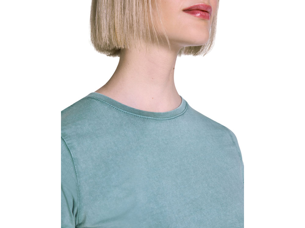 Женская футболка с коротким рукавом из 100% хлопка с аксидной стиркой. Круглый вырез горловины из риба 1х1. Отстрочка в тон по горловине.