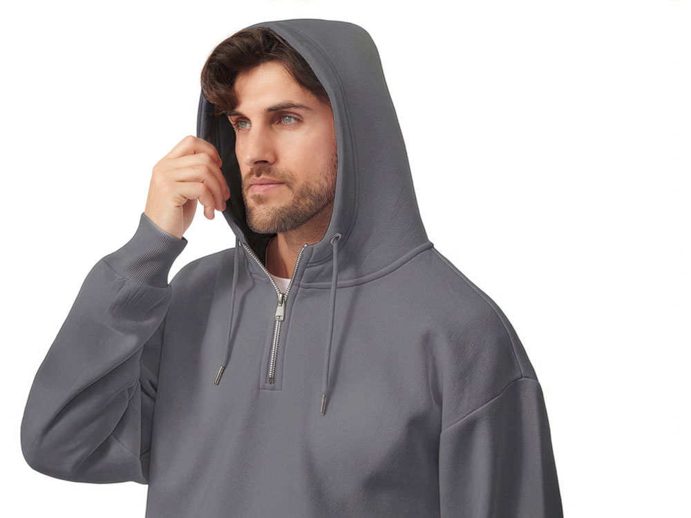 Худи с капюшоном ворот на молнии. Шнур в капюшоне с металлическими наконечниками. Отделка горловины спинки внутри тесьмой, Риб 2х2 по низу изделия и манжетам. Удобный карман кенгуру.