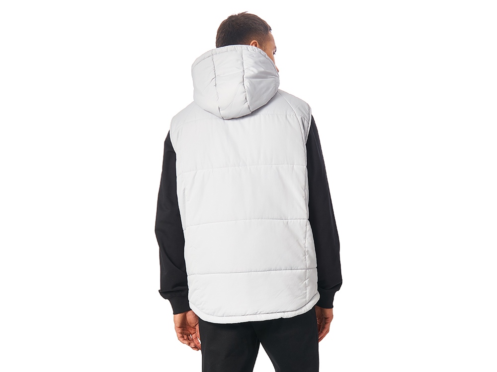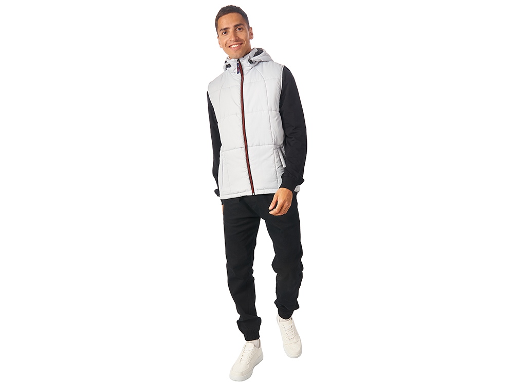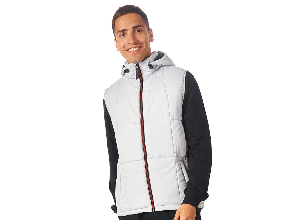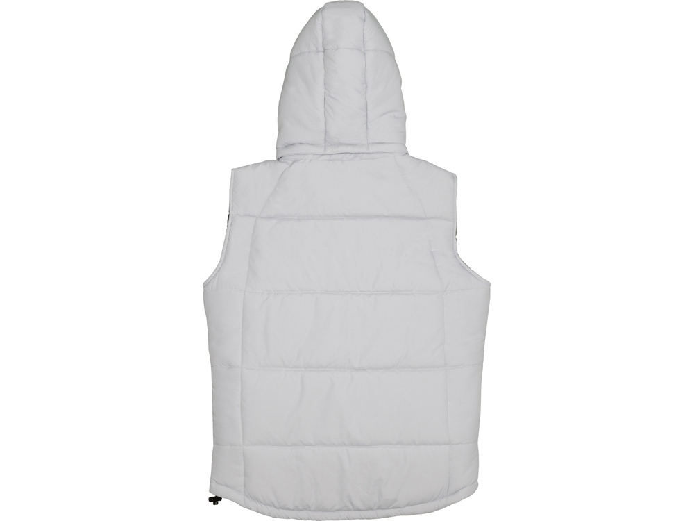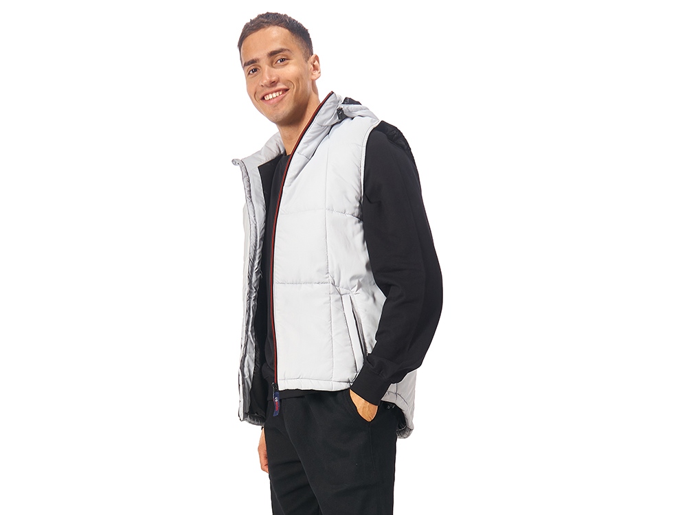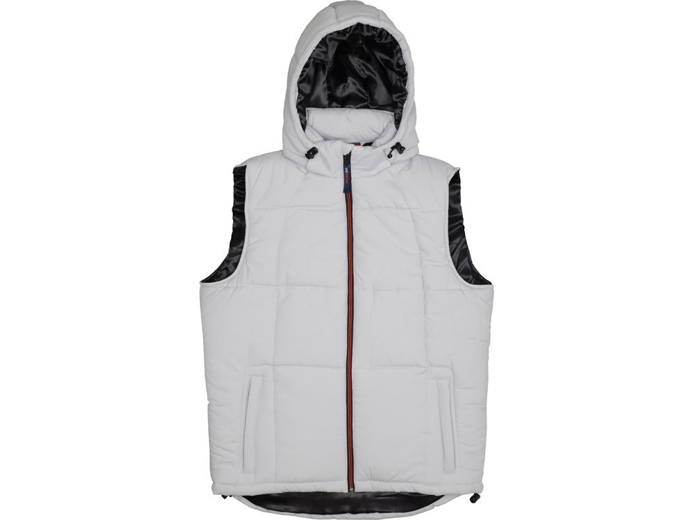 Утепленный жилет для мужчин *центральная молния контрастного цвета *два боковых кармана застегиваются на молнию *большой внутренний карман для документов или денег *контрастная внутренняя подкладка *эластичная кулиска с фиксаторами по низу изделия *задняя часть жилета длиннее передней *съемный капюшон *утеплитель 260гр и в капюшоне 200гр