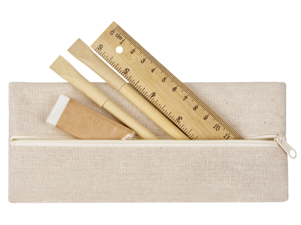 Удобный набор канцелярии со всем необходимым. В наборе: пенал на молнии, ручка Recycled, вечный карандаш в бамбуковом корпусе с колпачком из переработанной бумаги, ластик и бамбуковая линейка. Чтобы все самые необходимые пишущие принадлежности были под рукой.