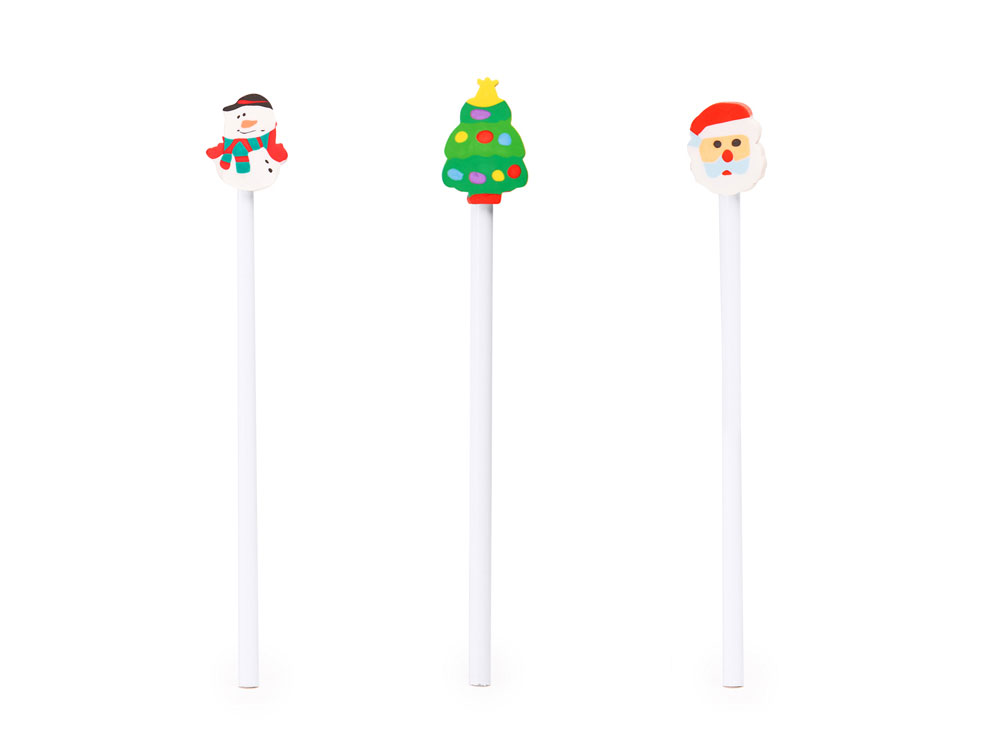 Белый круглый деревянный карандаш с ластиком доступен в трех рождественских вариантах: елка, Санта и снеговик.