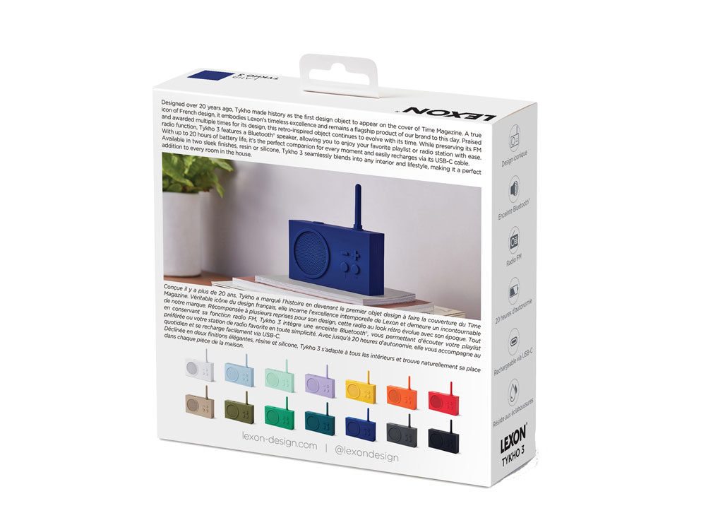 Созданный более 20 лет назад, Tykho вошёл в историю как первый дизайнерский объект, появившийся на обложке престижного журнала Time. Будучи символом французского дизайна, он воплощает непреходящее совершенство Lexon и по сей день остаётся культовым продуктом. Этот культовый радиоприёмник в ретро-стиле, многократно отмеченный наградами за свой дизайн, развивается в ногу со временем. Сохраняя традиционную функциональность FM-радио, Tykho теперь оснащён Bluetooth®-динамиком, что делает его неотъемлемой частью повседневной жизни. - Bluetooth®-динамик с FM-радио - Защита от брызг - Диапазон частот: FM 88 108 МГц - Радиус действия Bluetooth®: 10 м - Срок службы батареи: 20 ч - Время зарядки: 4 ч - Заряжается через USB-C - кабель в комплекте