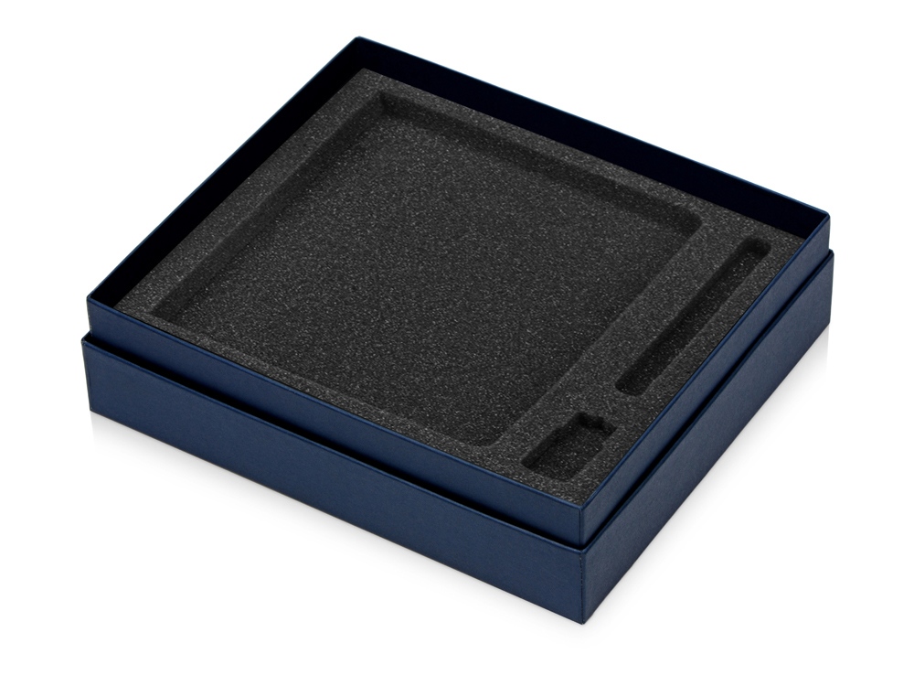 Коробка с ложементом для ручки, флешки и блокнота А5. Коробка изготовлена из переплетного картона кашированного дизайнерской бумагой эфалин, ложемент изготовлен из поролона премиум-класса. Размеры секций: для блокнота - 213 х 143 х 15 мм, для флешки - 55 х 19 х 8 мм, для ручки - 137 х 11 х 10 мм.