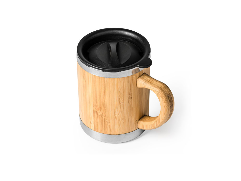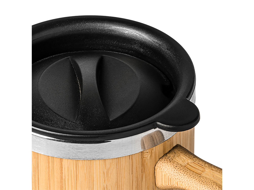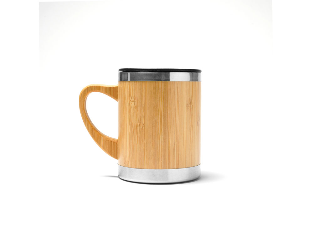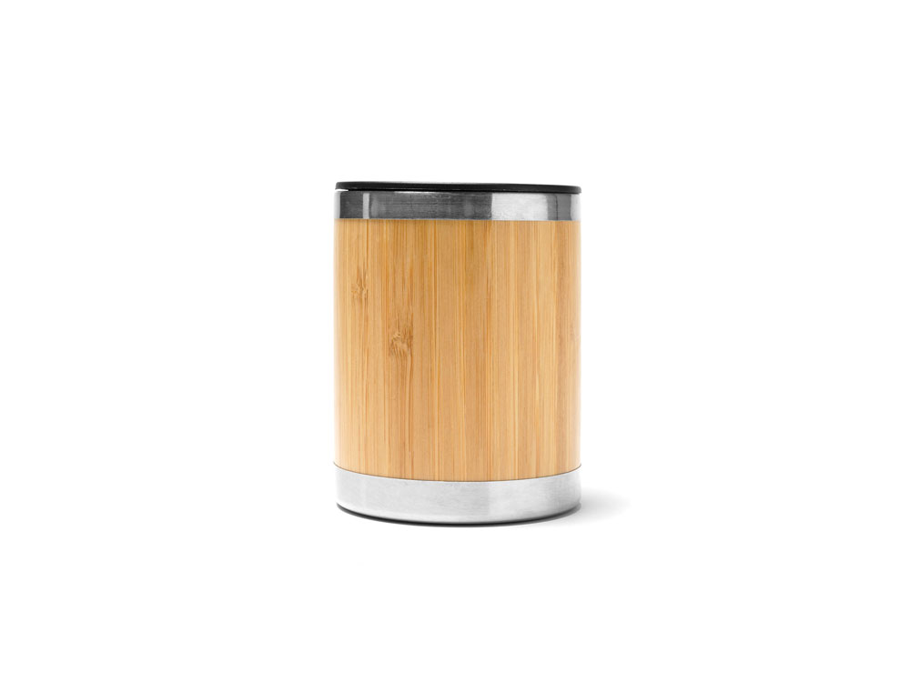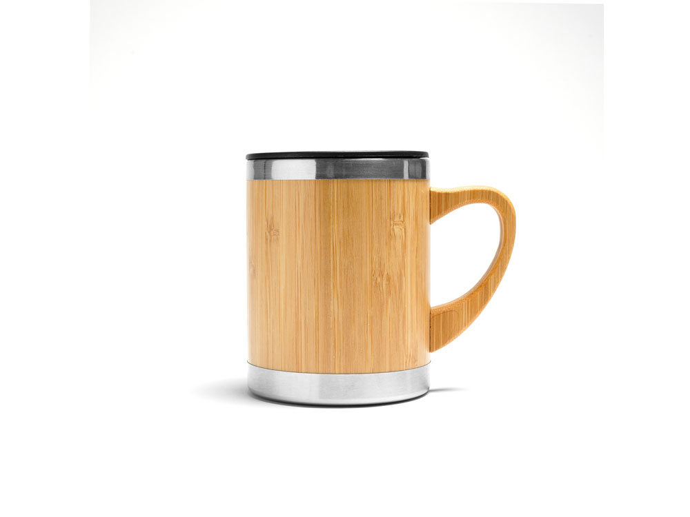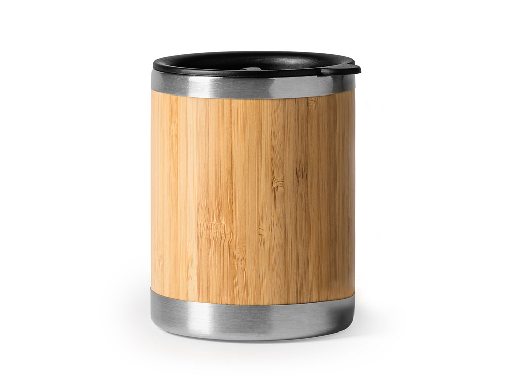 Кружка из нержавеющей стали с двойными стенками и бамбуковой поверхностью. В комплекте колпачок-дозатор. Объем 340 мл.