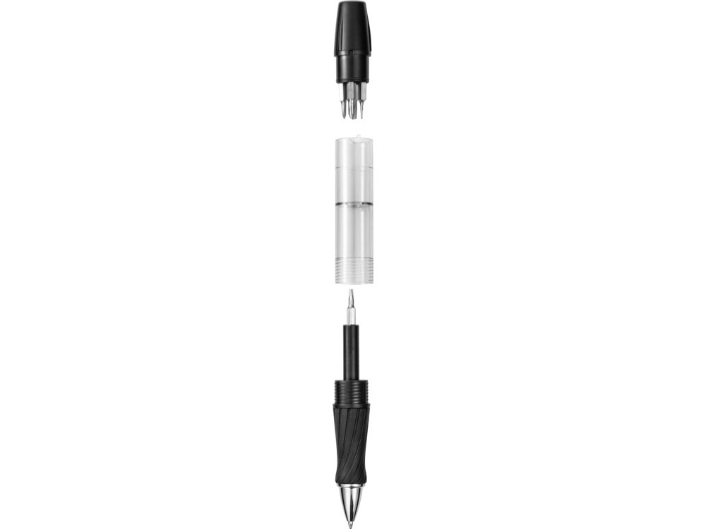 Инструмент Joker 7-в-1 с ручкой и фонариком. Шариковая ручка с поворотным механизмом, корпус- холдер для 5-ти насадок отверток. Светодиодный фонарик с поворотным включением. Батарейки в комплекте. АБС пластик.