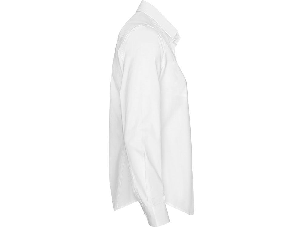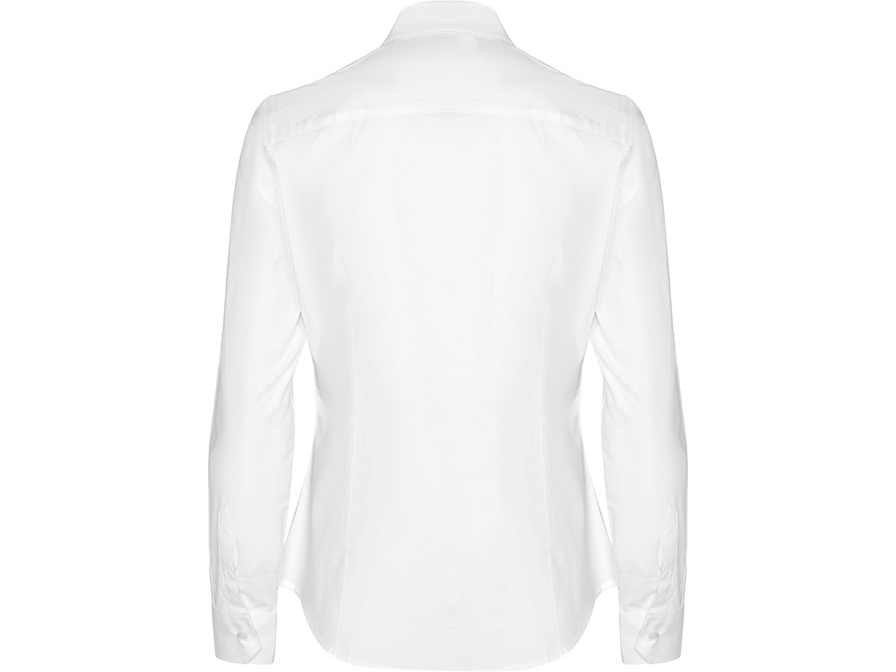 Рубашка с длинным рукавом для женщин из эластичного материала · Проклеенный воротник. · Складка на спинке. · Две пуговицы на манжетах. · Кокетка на спинке. · Закругленный низ.