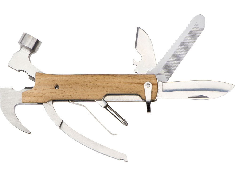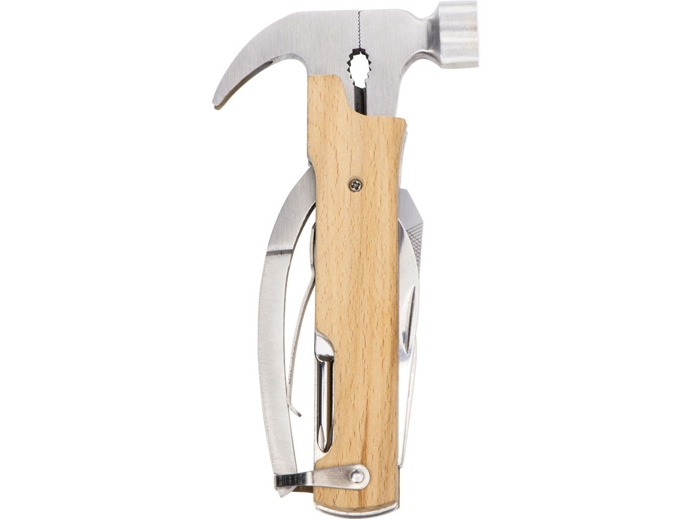 Многофункциональный инструмент, который выручит дома, на даче, в путешествии, походе и во множестве других ситуаций. Полностью сделан из металла и декорирован накладками из натурального дерева. Чехол в комплекте. Основные функции: - Молоток - Плоскогубцы - Гвозодер - Кусачки - Пила - Напильник - Нож - Открывашка - Отвертка (крестовая и плоская)