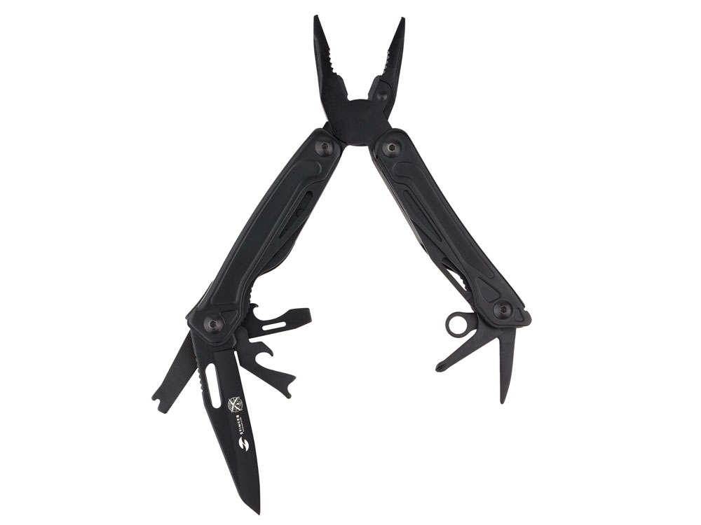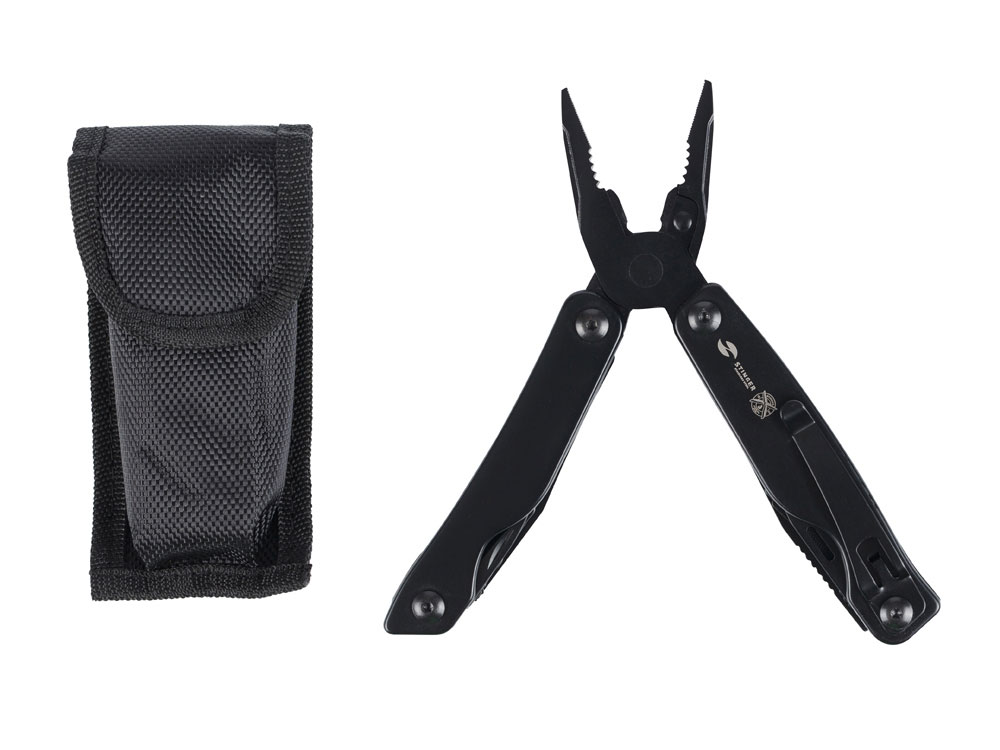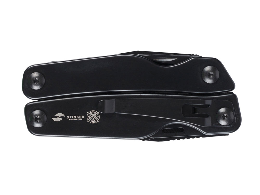 Мультитул Stinger, 100x40 мм, 11 функций, сталь, чёрный, в комплекте нейлоновый чехол купить оптом и в розницу с нанесением логотипа в Санкт-Петербурге