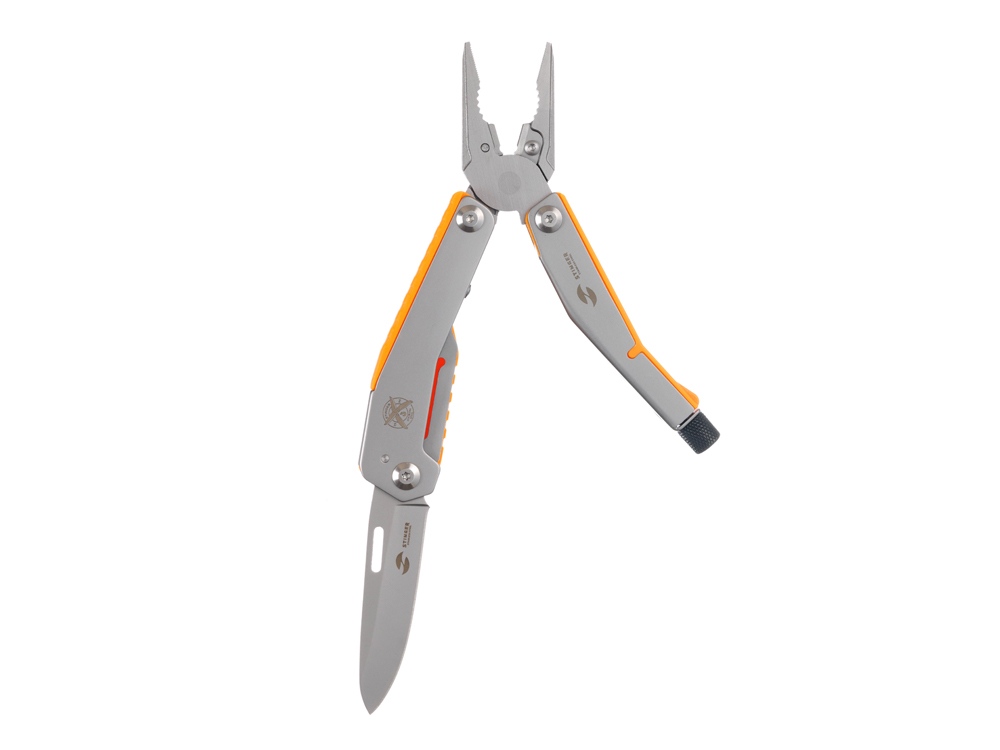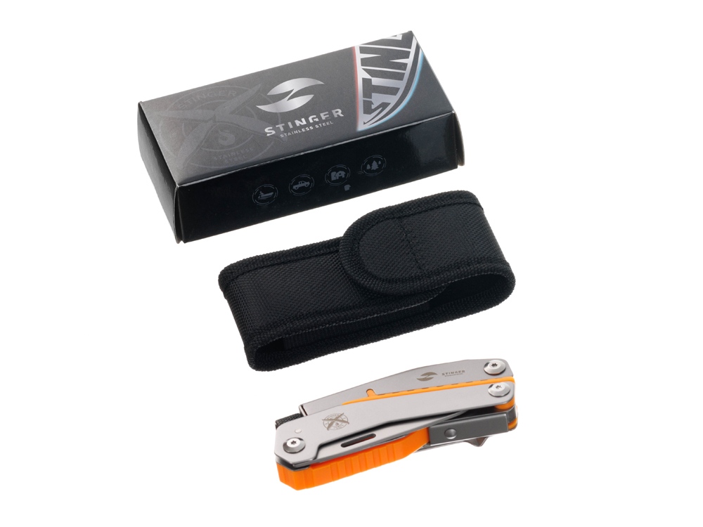 МНОГОФУНКЦИОНАЛЬНЫЙ ИНСТРУМЕНТ STINGER С НАБОРОМ ИЗ 8 ФУНКЦИЙ 1. Острогубцы 2. Плоскогубцы 3. Кусачки 4. Лезвие с фиксатором клинка Liner Lock 5. Адаптер для бит 6. Плоская отвертка 7. Крестовая отвертка 8. Клип ХАРАКТЕРИСТИКИ Материалы • лезвие/инструменты: нержавеющая сталь 440A, твердость 54-58 HRC • рукоять: нержавеющая сталь 440A, твердость 54-58 HRC • накладки рукояти: АБС-пластик Размеры • Размеры мультитула: 105х40х22 мм • Общая длина: 176 мм • Длина клинка: 71 мм • Наибольшая ширина клинка: 19,2 мм • Толщина обуха: 2 мм • Длина рукояти: 105 мм • Ширина рукояти (в ср.части): 39,8 мм • Толщина рукояти (в ср.части): 17,1 мм Вес: 184 г Цвет накладок рукояти: оранжевый Накладки рукояти мультитула не подлежат замене Комплектация: набор из 2 бит, нейлоновый чехол Упаковка: картонная коробка
