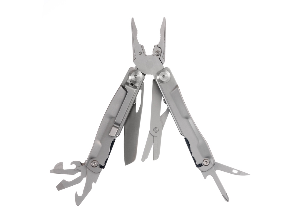 МНОГОФУНКЦИОНАЛЬНЫЙ ИНСТРУМЕНТ STINGER С НАБОРОМ ИЗ 14 ФУНКЦИЙ 1. Острогубцы 2. Плоскогубцы 3. Кусачки сменные 4. Лезвие с фиксатором клинка Liner Lock 5. Ножницы 6. Многоцелевой резак (стропорез, резак для автомобильного ремня) 7. Открывалка для бутылок с: 8. - Плоской отверткой 9. Консервный нож с: 10. - Мини-плоской отверткой 11. - Инструментом для снятия изоляции 12. Крестовая отвертка 13. Шило/кёрнер с: 14. - Иглой 15. Клип ХАРАКТЕРИСТИКИ Материалы • лезвие/инструменты: нержавеющая сталь 440A, твердость 54-58 HRC • рукоять: нержавеющая сталь 440A, твердость 54-58 HRC Размеры • Размеры мультитула: 106х38х20 мм • Общая длина: 185,2 мм • Длина клинка: 79,1 мм • Наибольшая ширина клинка: 17 мм • Толщина обуха: 2,5 мм • Длина рукояти: 106,1 мм • Ширина рукояти (в ср.части): 38,5 мм • Толщина рукояти (в ср.части): 18,1 мм Вес: 255 г Комплектация: адаптер для бит, набор из 11 бит, нейлоновый чехол Упаковка: картонная коробка