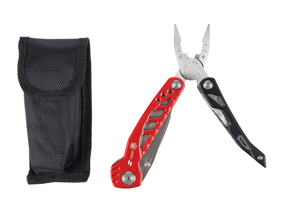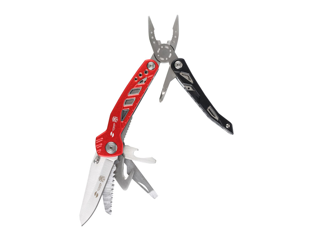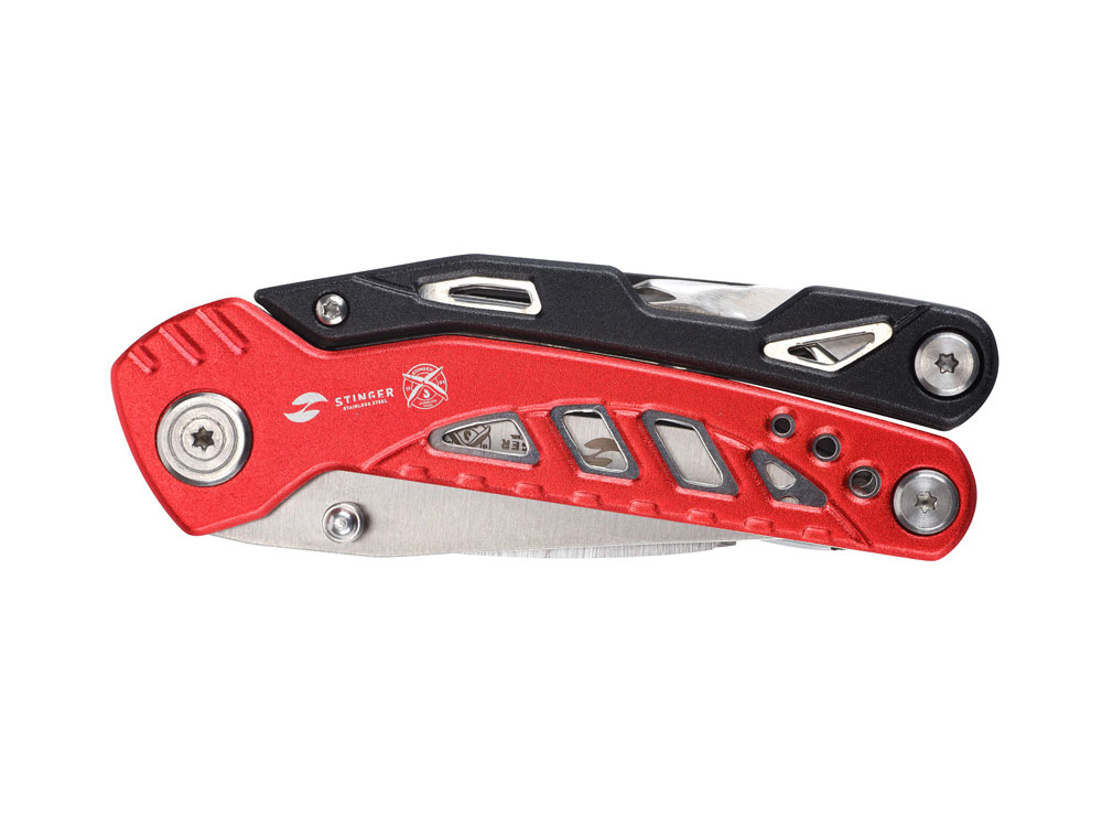 Мультитул Stinger, 105x30 мм, 11 функций, сталь/алюминий, красно-чёрный, в нейлоновом чехле